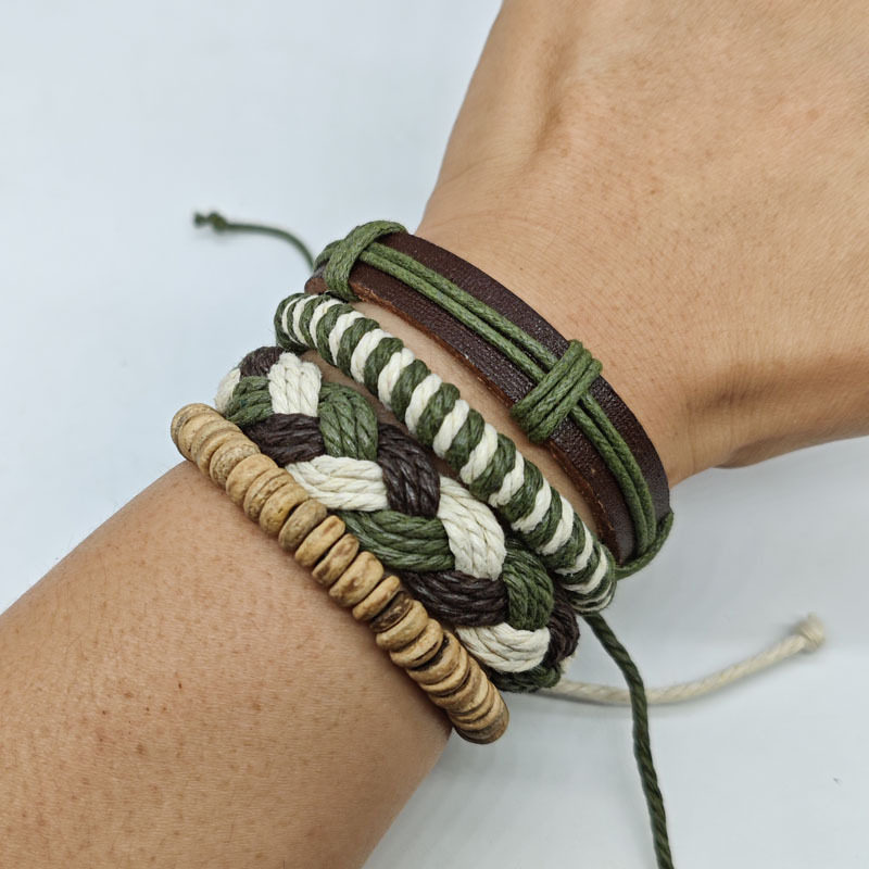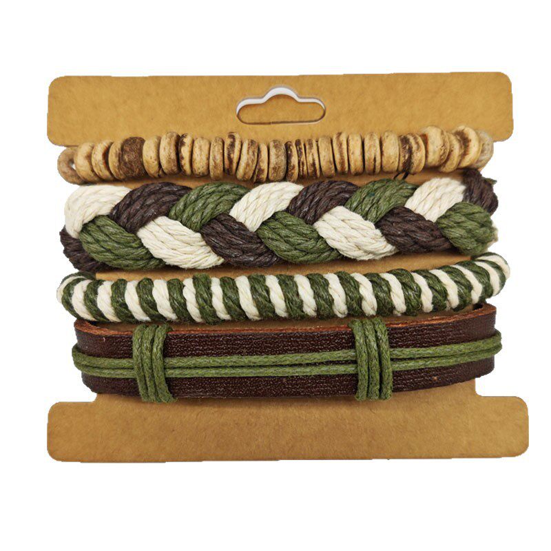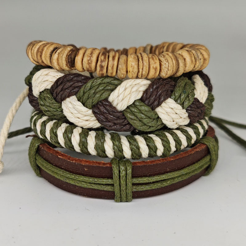 绿色手链4件套装欧美流行个性编织多层麻绳手绳简约男士皮革手环