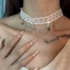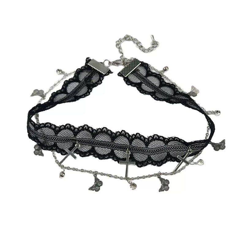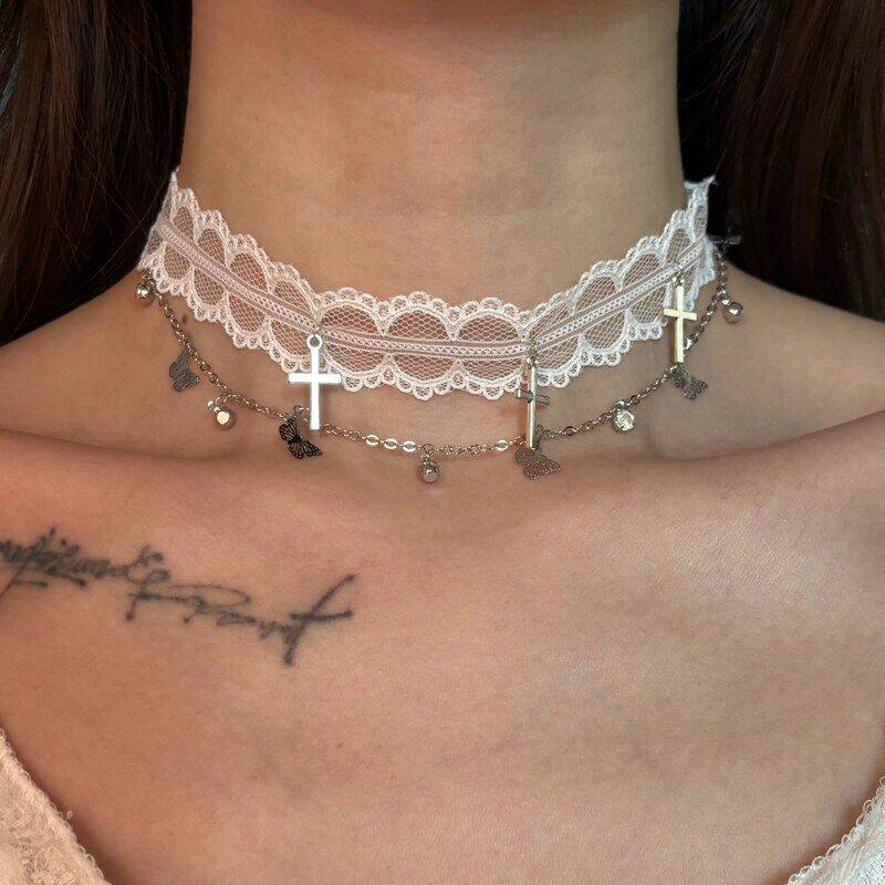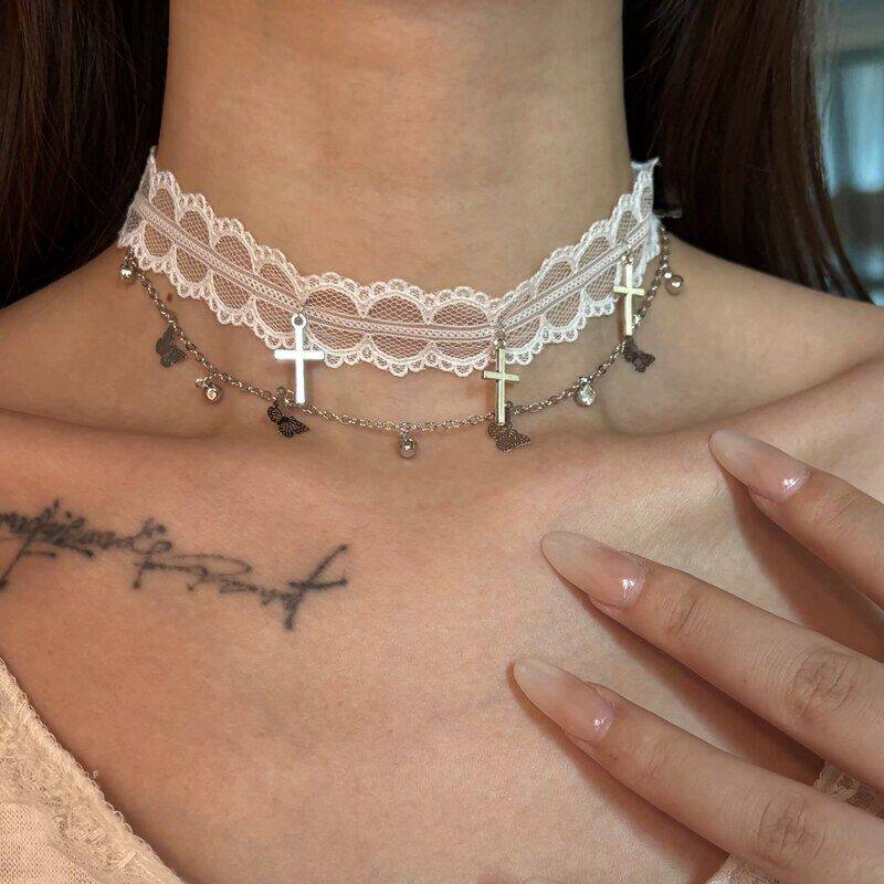 白色蕾丝花边choker十字架蝴蝶吊坠短款颈带少女心项圈洛丽塔配饰