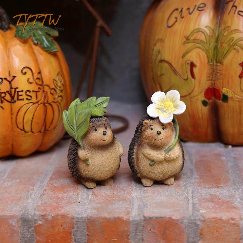 可爱绿叶小黄花小刺猬树脂萌物创意橱窗玄关饭厅摆件庭院花园装饰