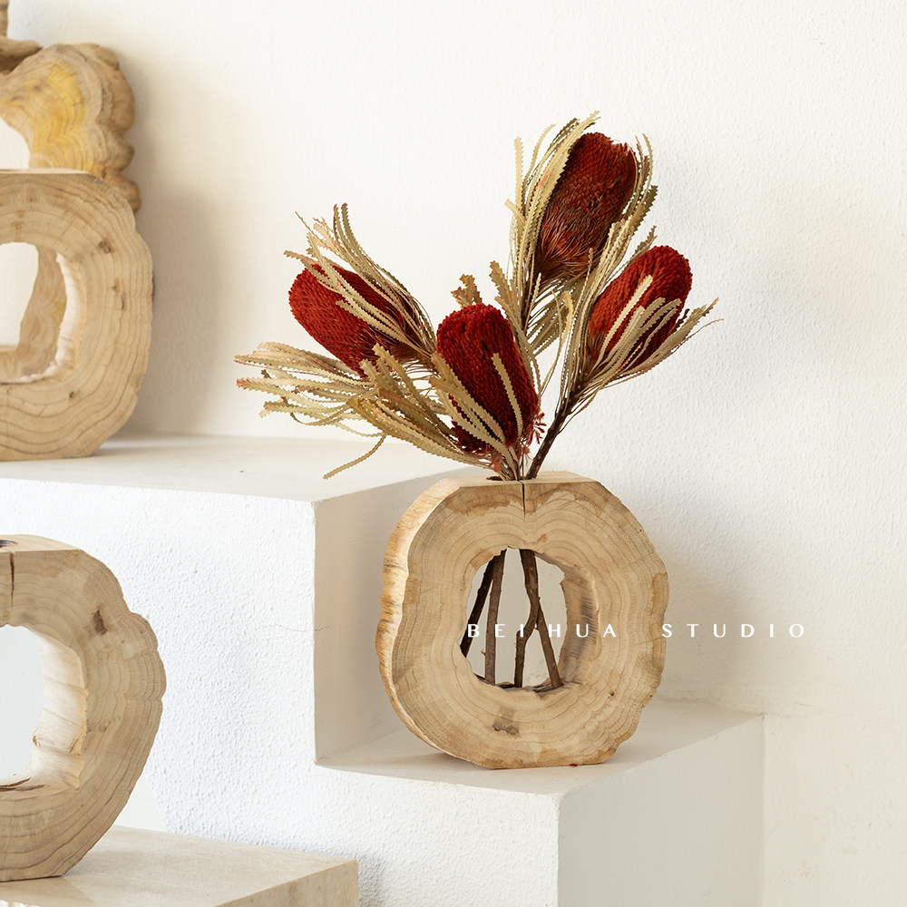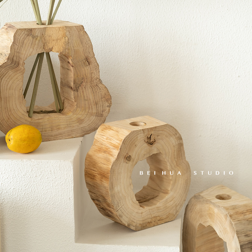 原木手工诧寂雕琢风情花器 艺术美学摆件 自然韵味装点新中式家居
