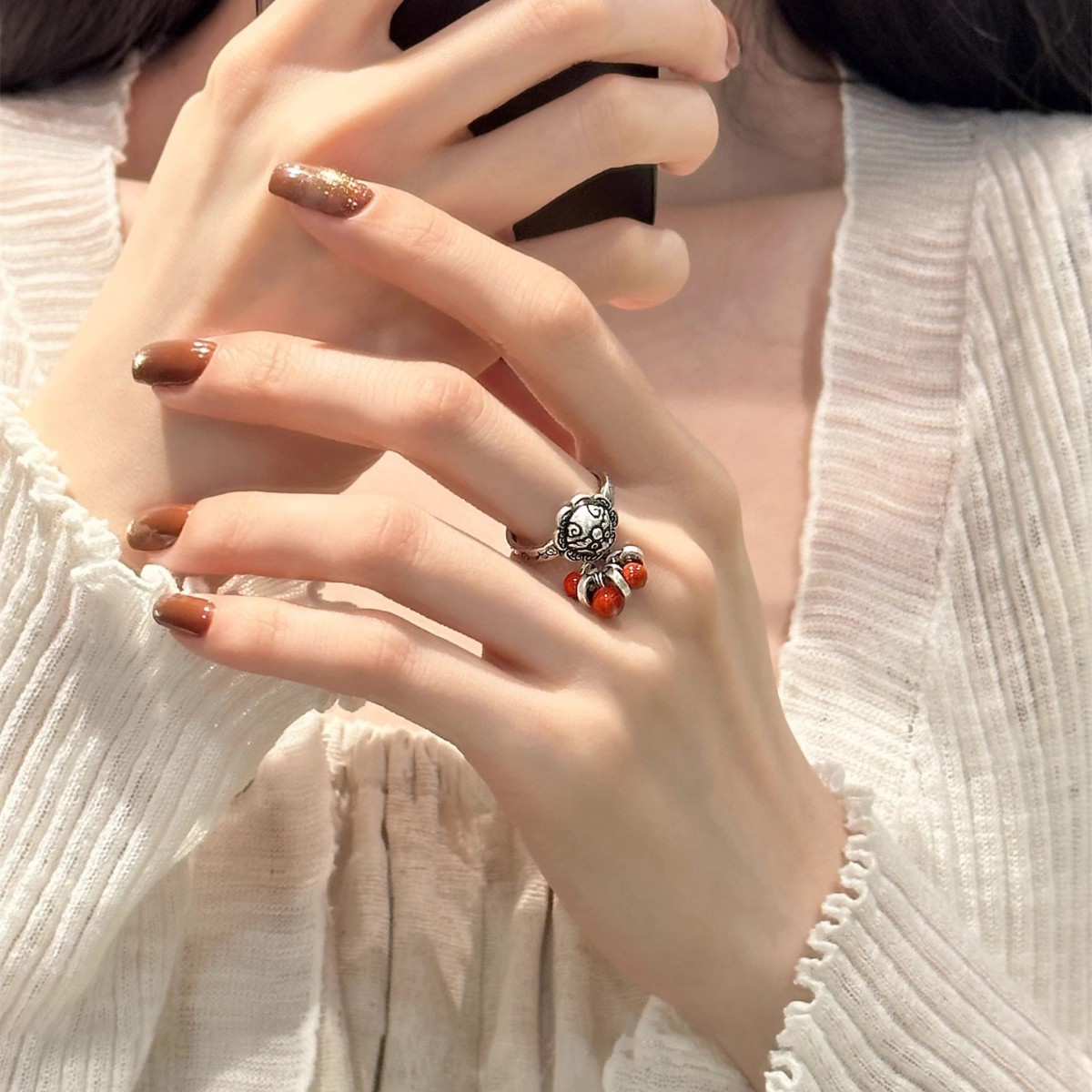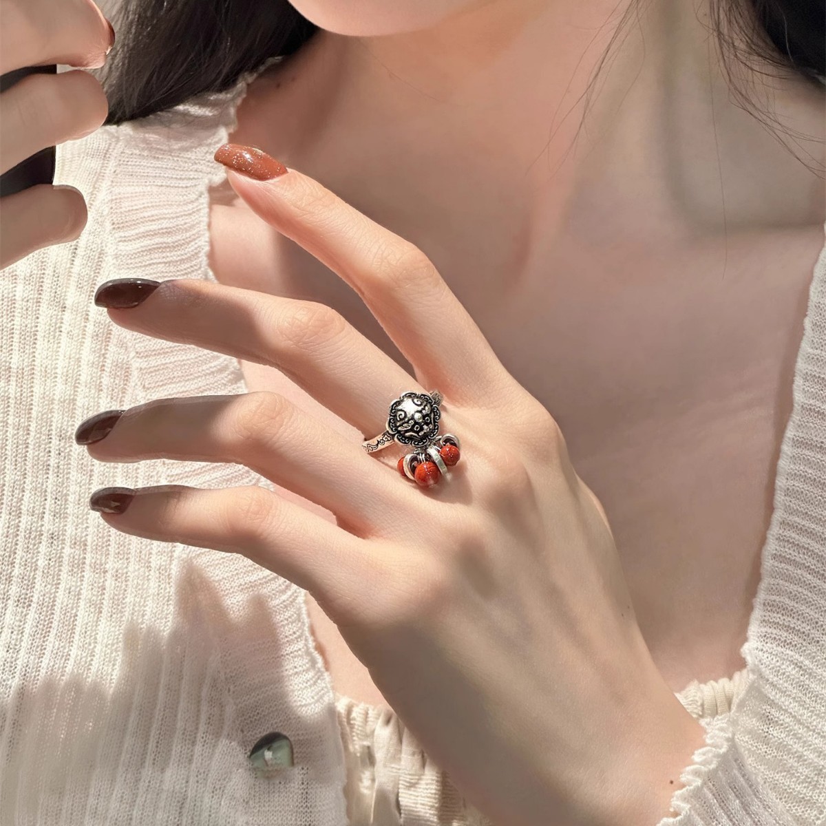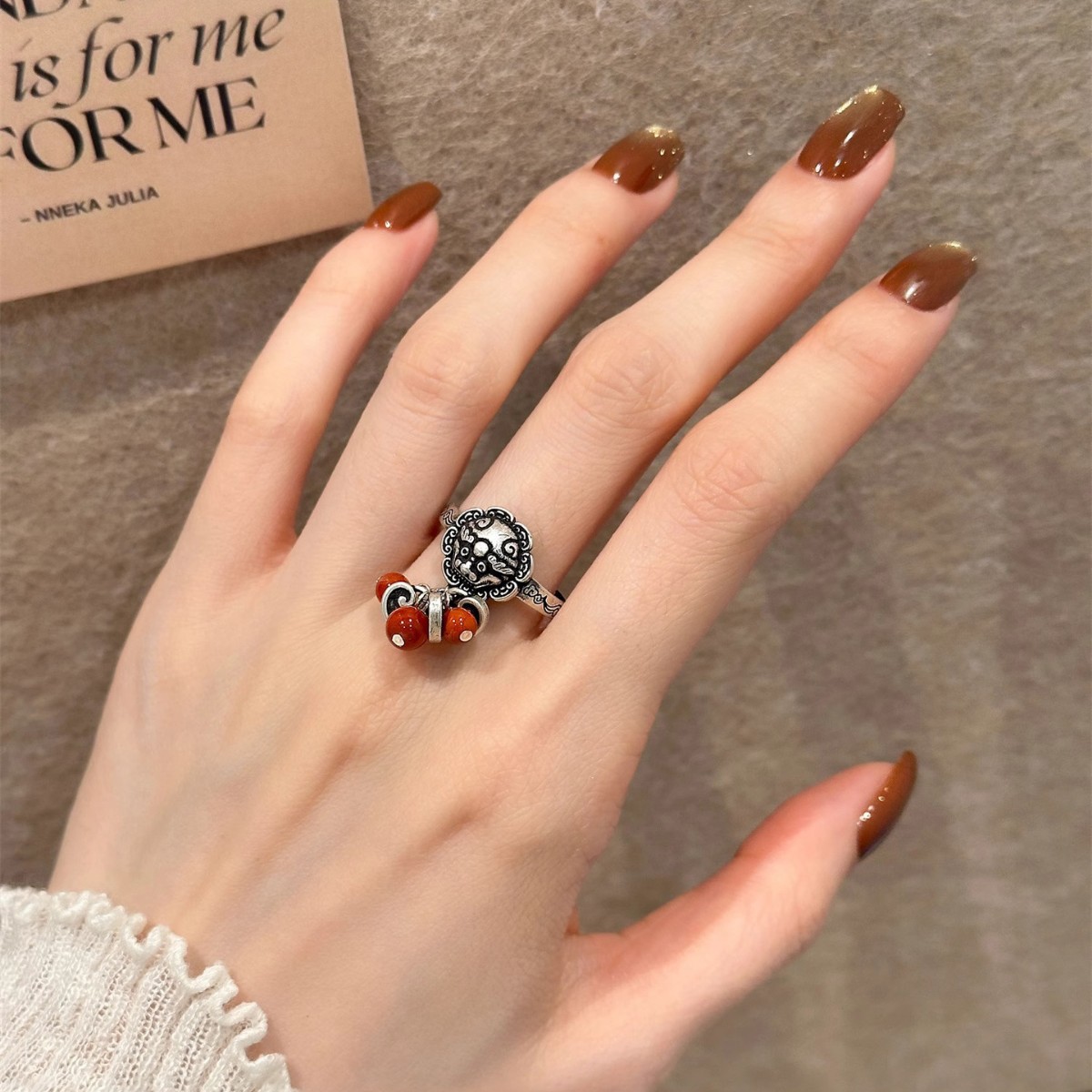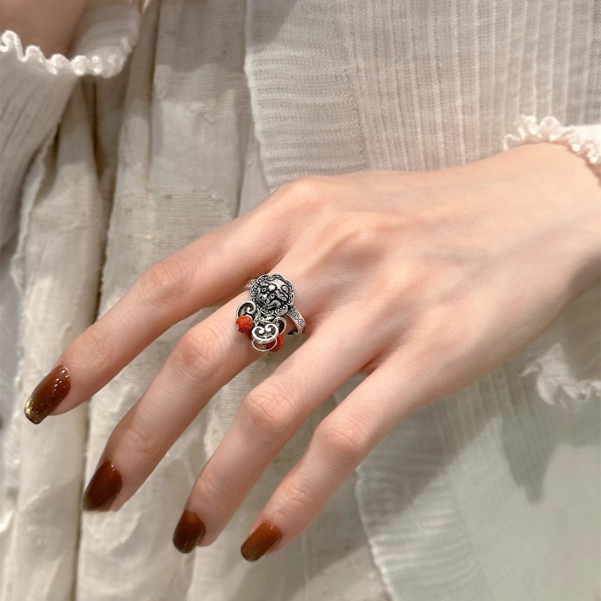 一恋醒狮红色小圆珠吊坠戒指女复古时尚民族风新中式开口指环食指