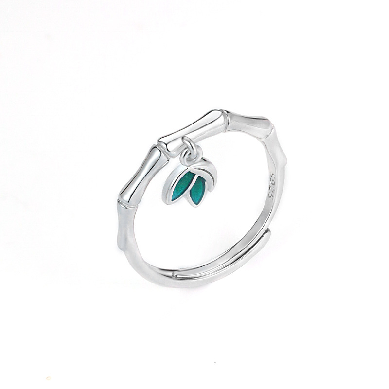精工有你竹够竹节绿色树叶S925纯银戒指女开口小众设计级感指环