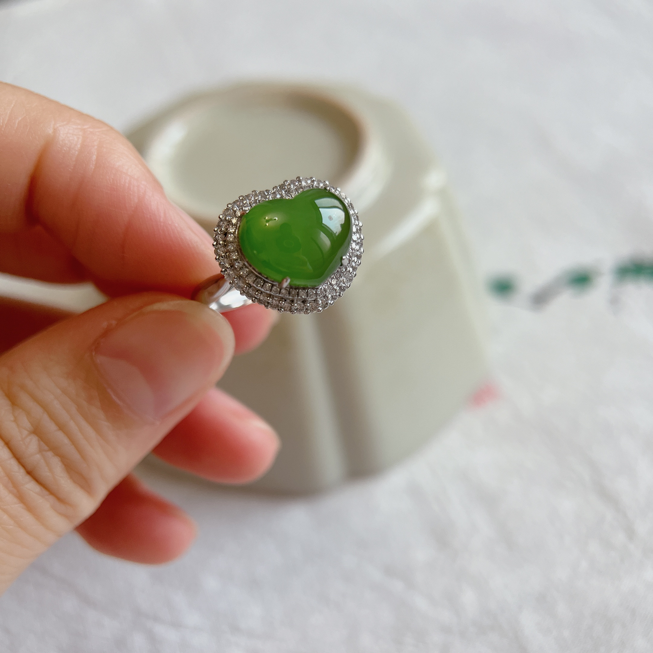 高品质天然和田玉俄碧玉绿猫眼一线天18K白金豪镶钻石爱心形戒指