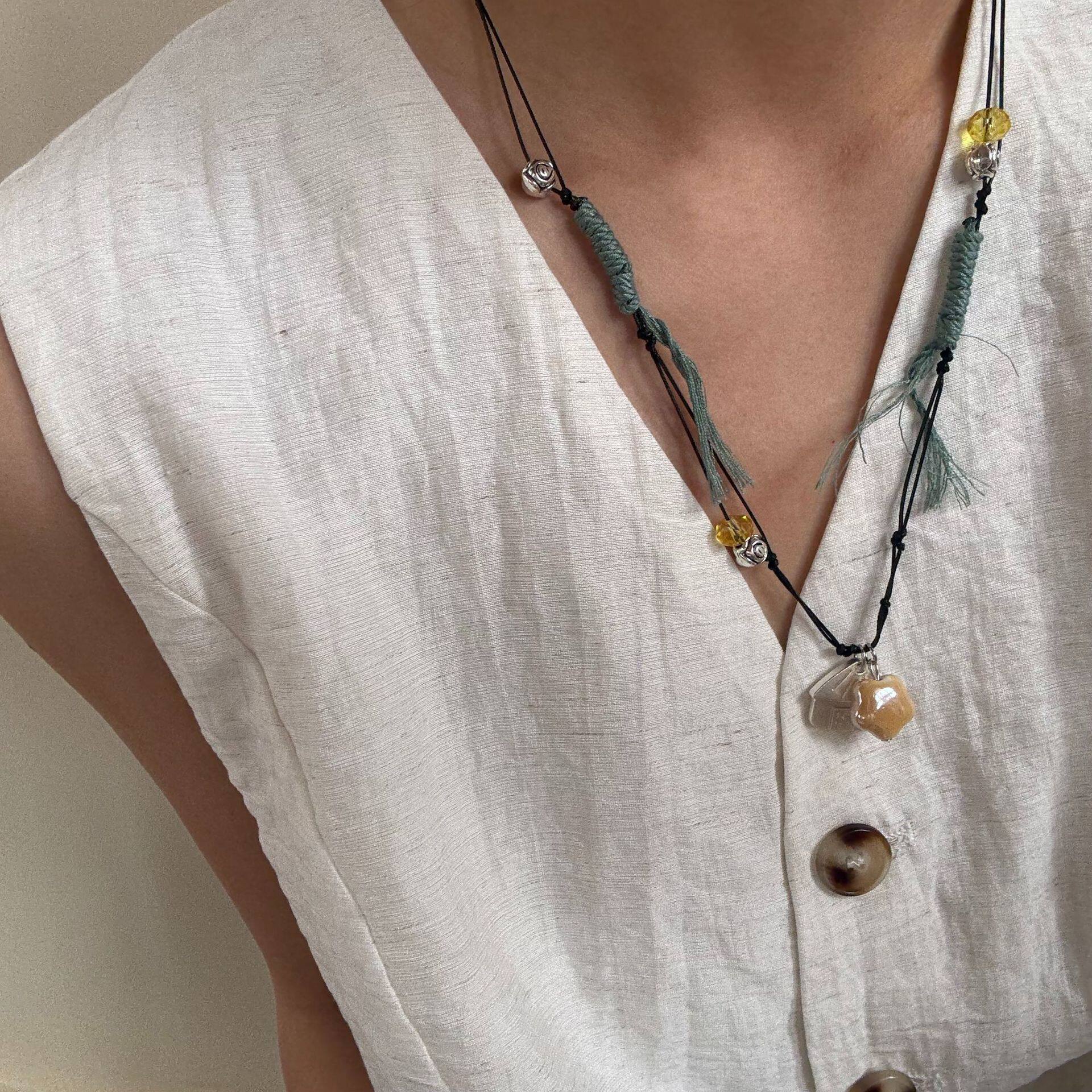 小众设计编织项链绳可调节陶瓷星星配饰帐篷吊坠爱心天然石毛衣链