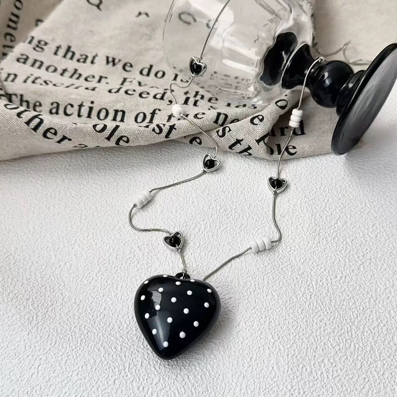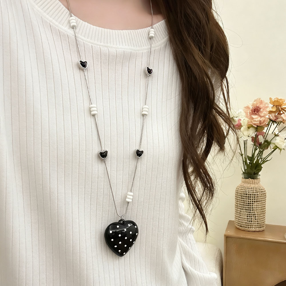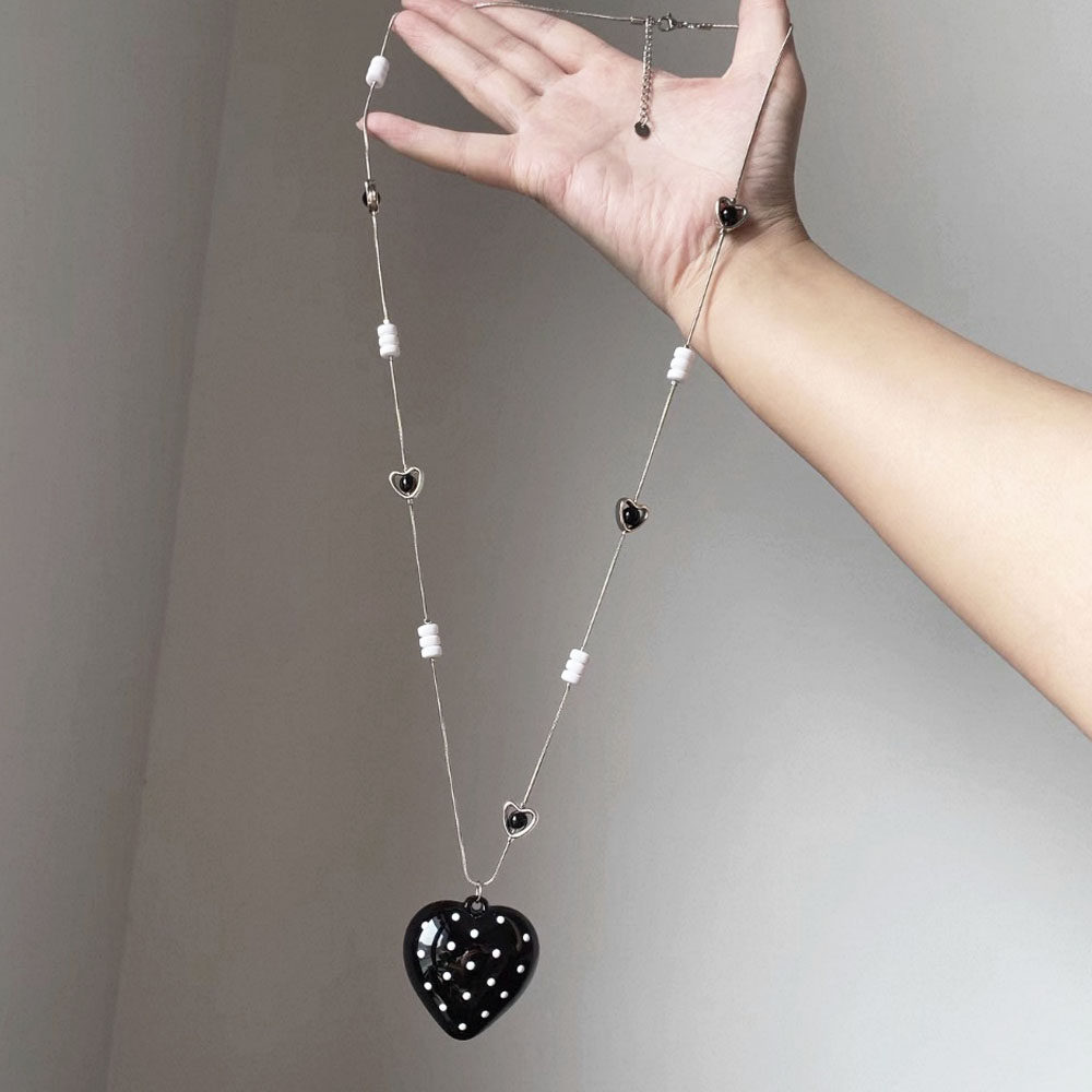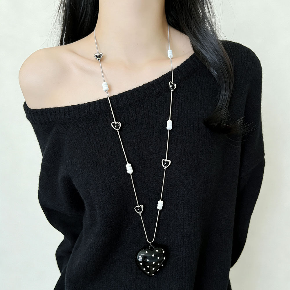 甜酷ins风黑色波点爱心吊坠项链女小众高级感简约时髦长款毛衣链