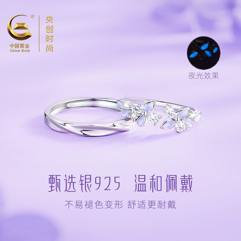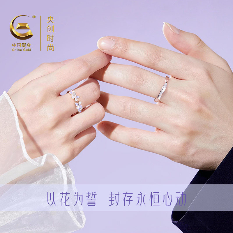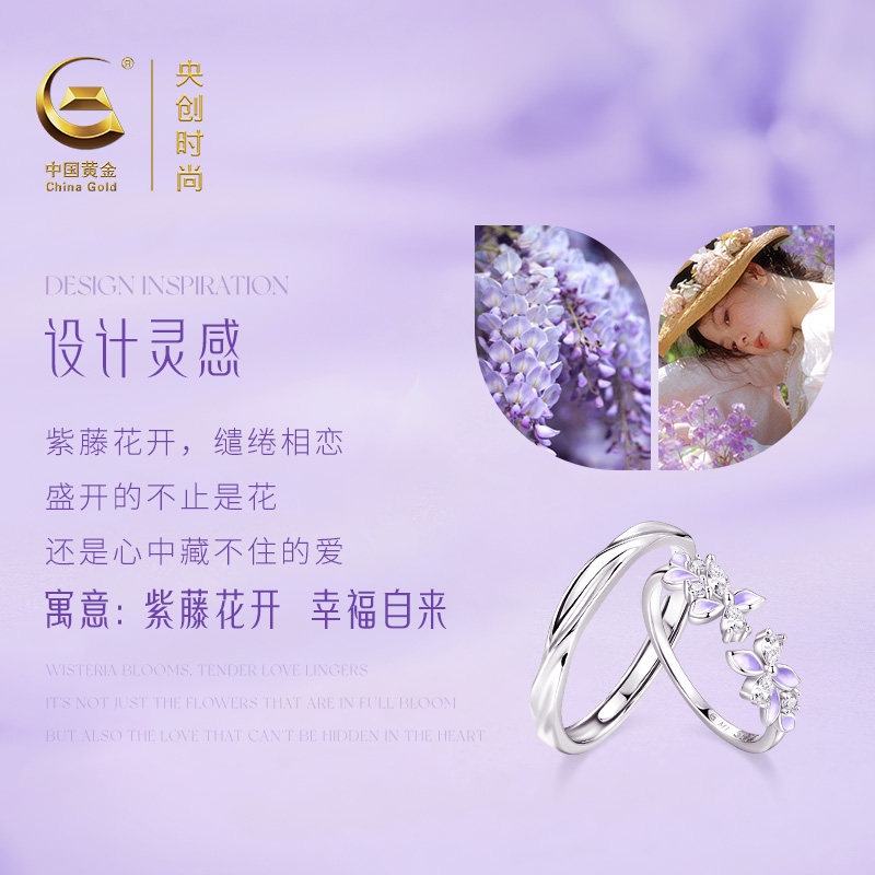 中国黄金央创紫藤花戒指情侣对戒纯银可调节生日礼物送女友S925
