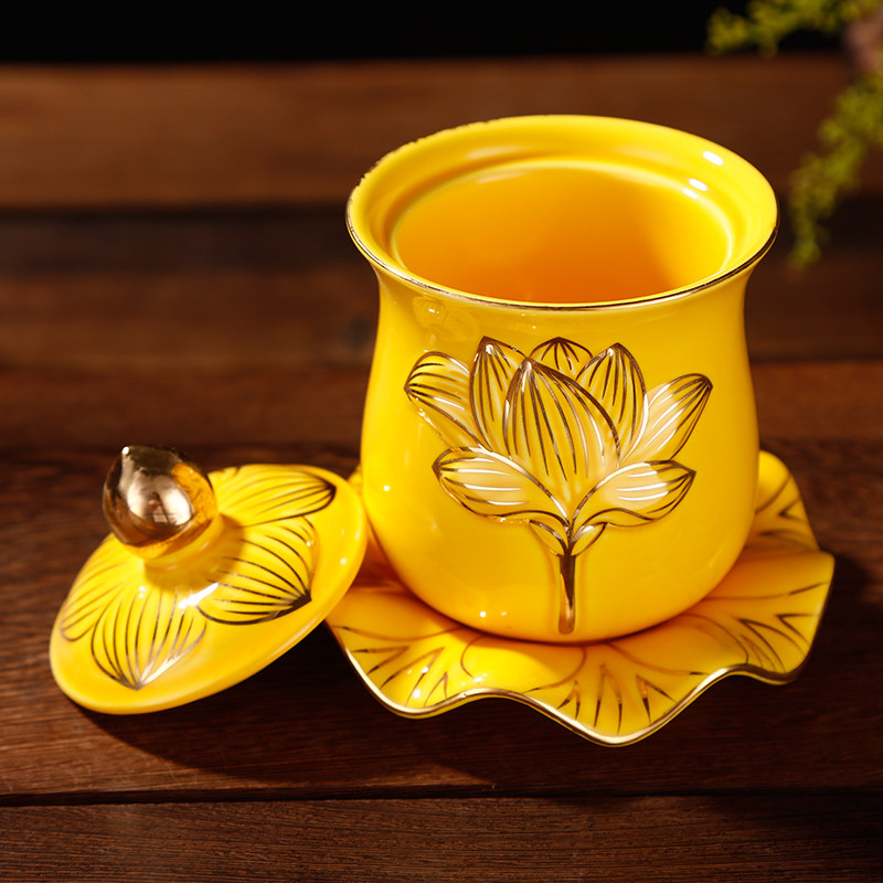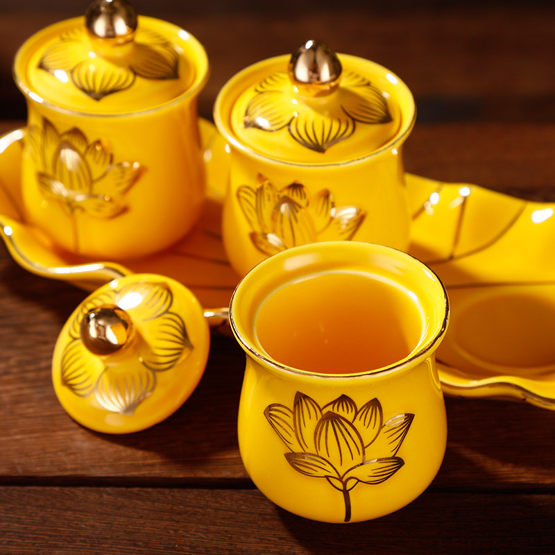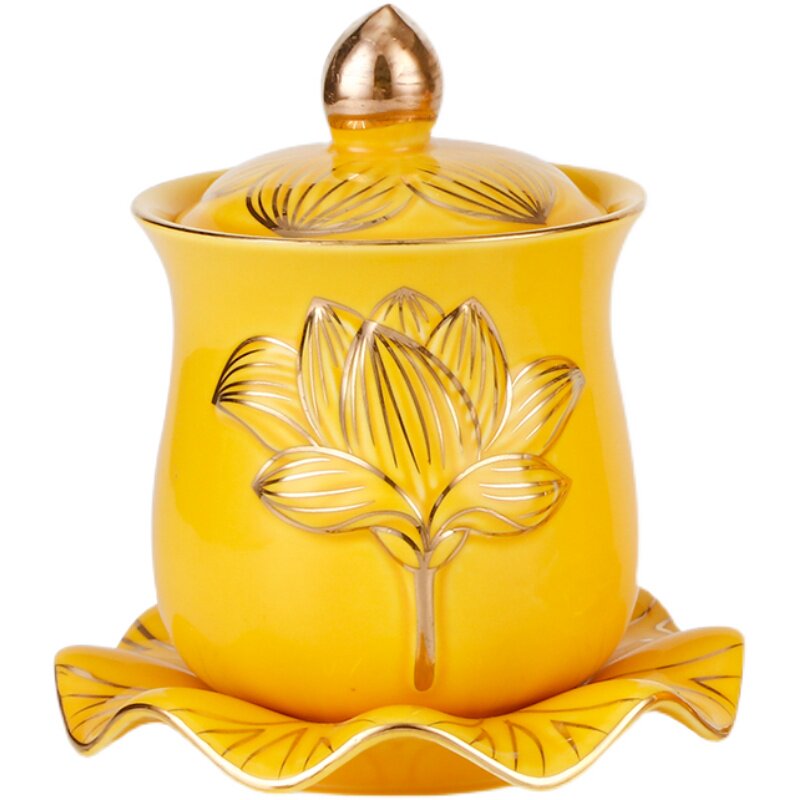 佛具家居陶瓷黄色浮雕莲花供水杯净水杯观音杯佛供杯佛堂供具摆件