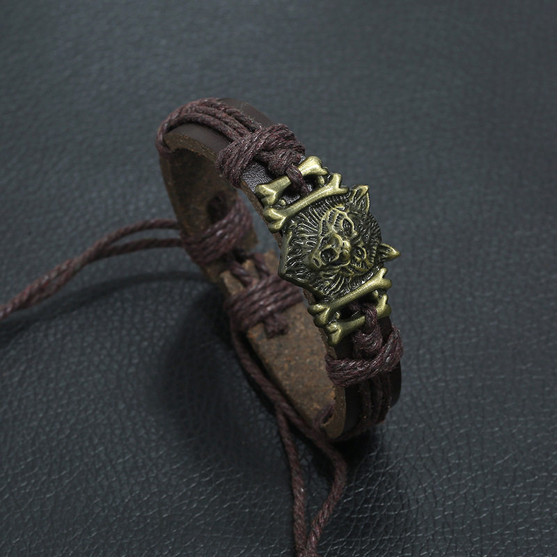 饰品复古编织皮革手链手绳古铜合金狼头仿牛皮手链首饰 bracelet