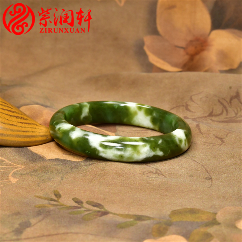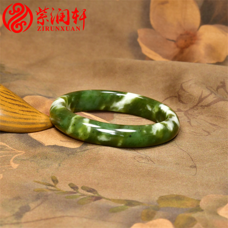 紫润轩新疆和田玉碧玉手镯57 5MM山流水料白加绿菠菜绿玉镯传家级
