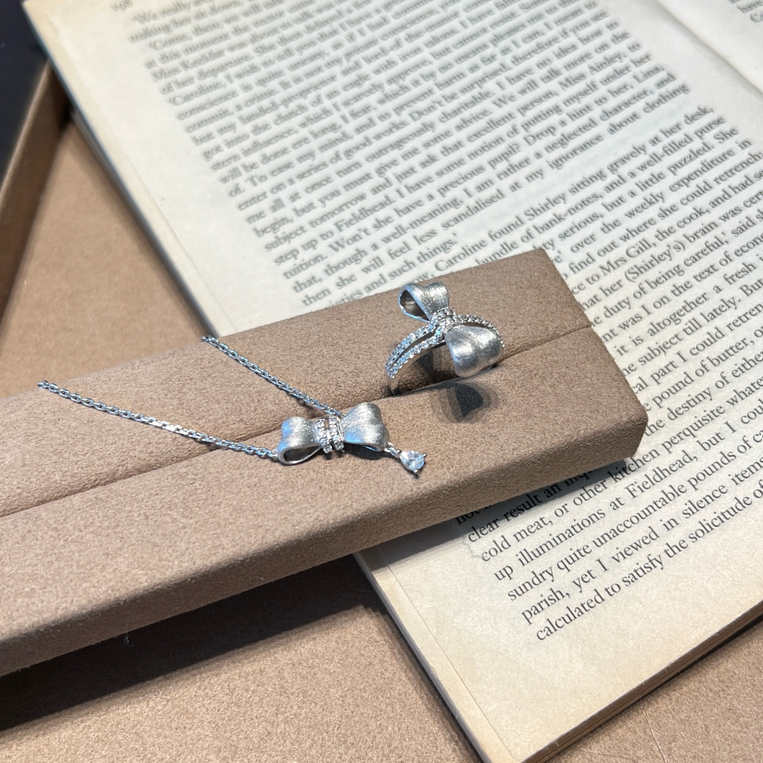 925银蝴蝶结项链戒指女轻奢小众设计高级感水滴吊坠银色链饰品