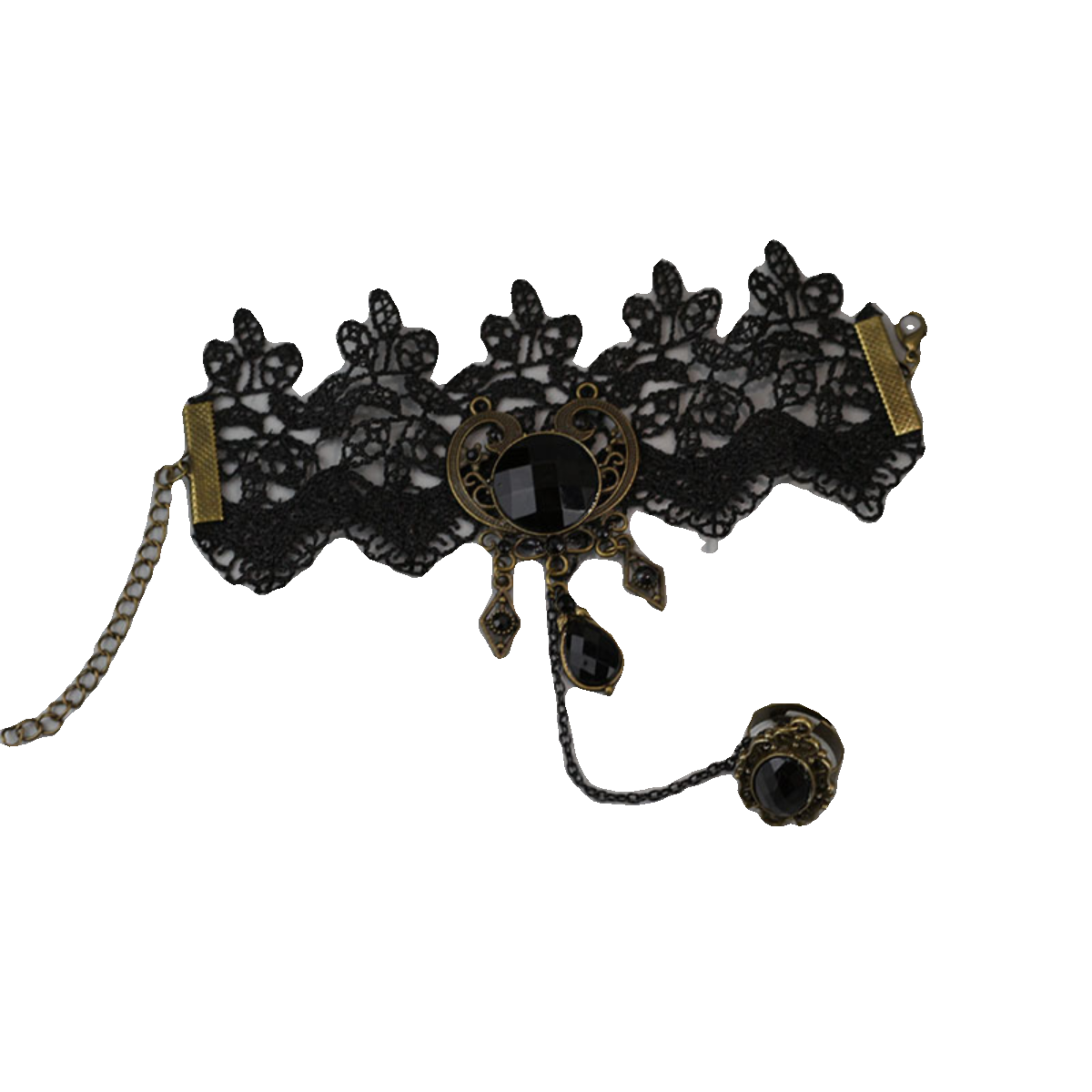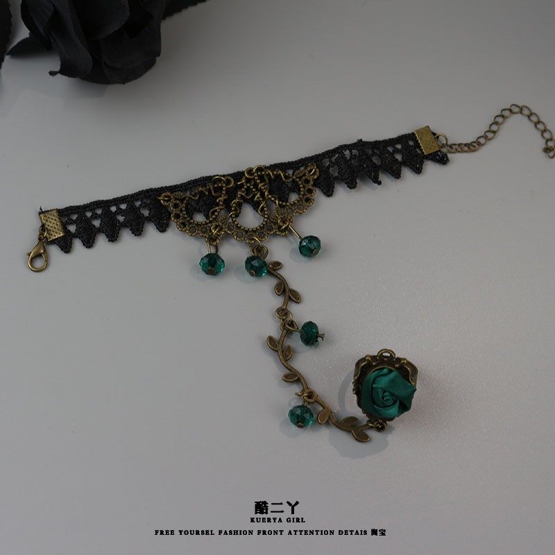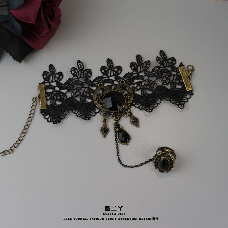 清仓捡漏黑色蕾丝手链戒指一体链复古哥特配饰玫瑰花Lolita手饰