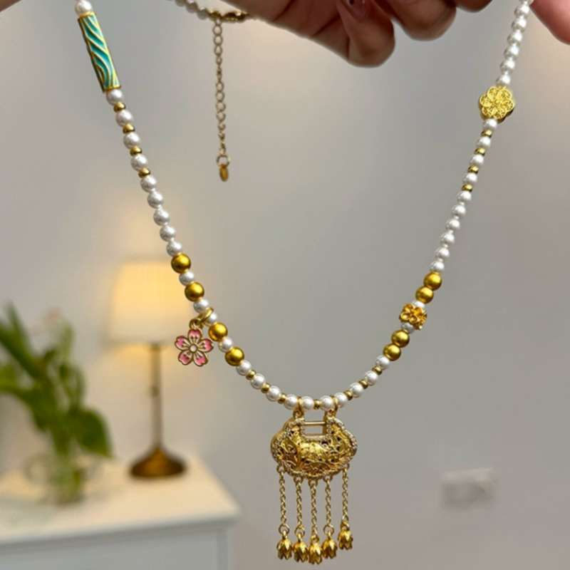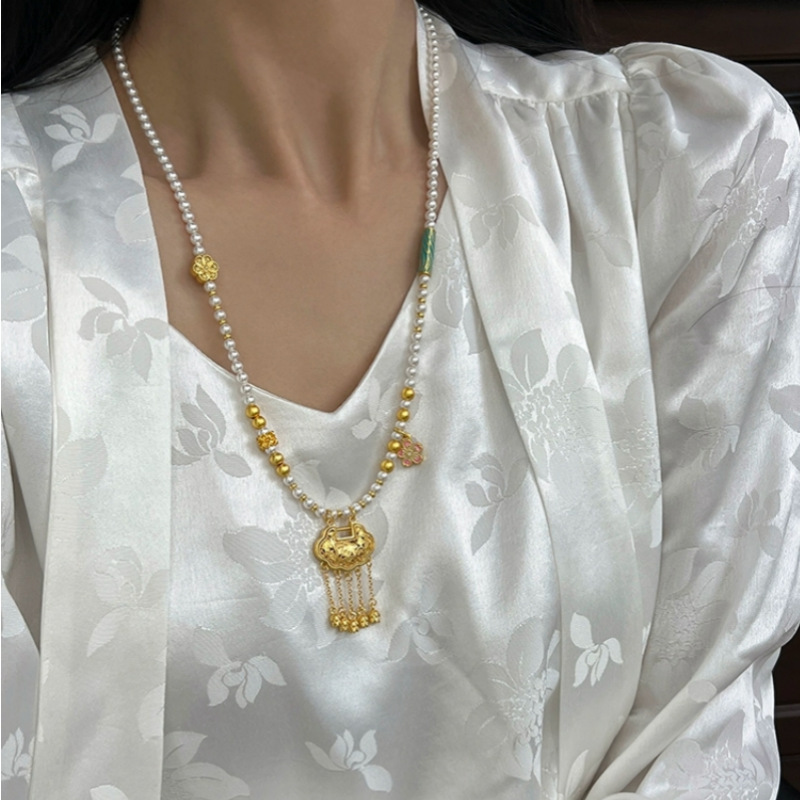 新中式项链古法沙金项链平安如意锁施家珍珠长款项链2024新款项饰