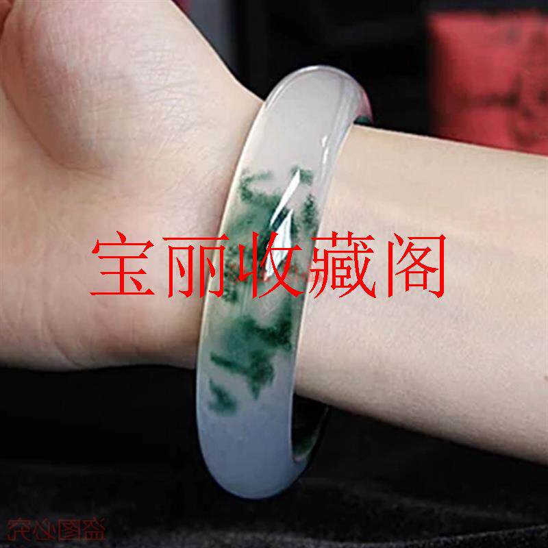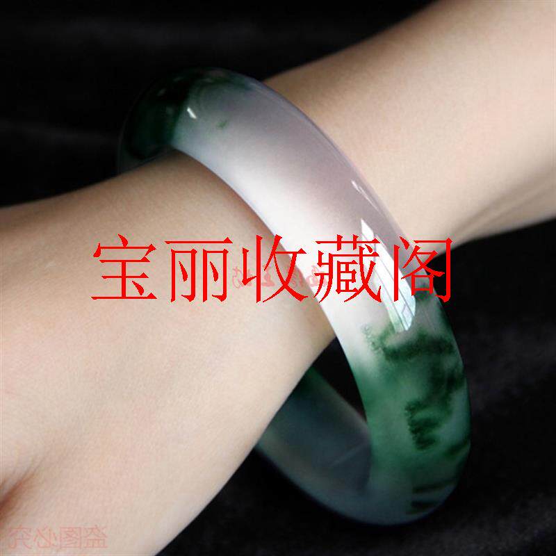 冰种飘绿色石英岩玉手镯女款飘花玉镯玉石少女扁条镯子饰品送礼