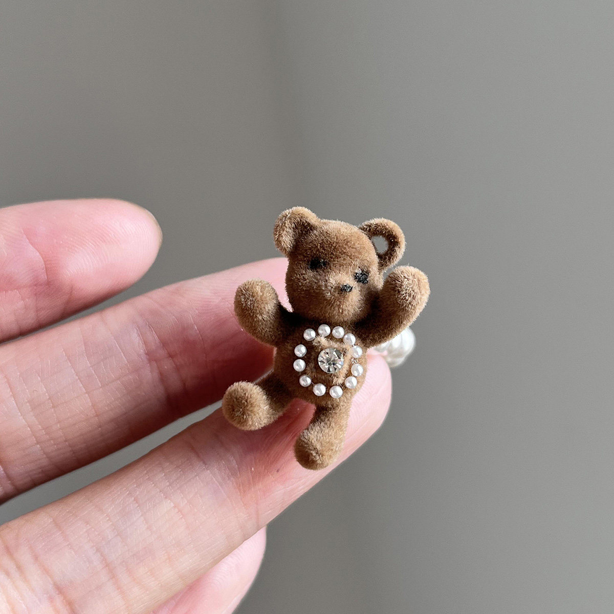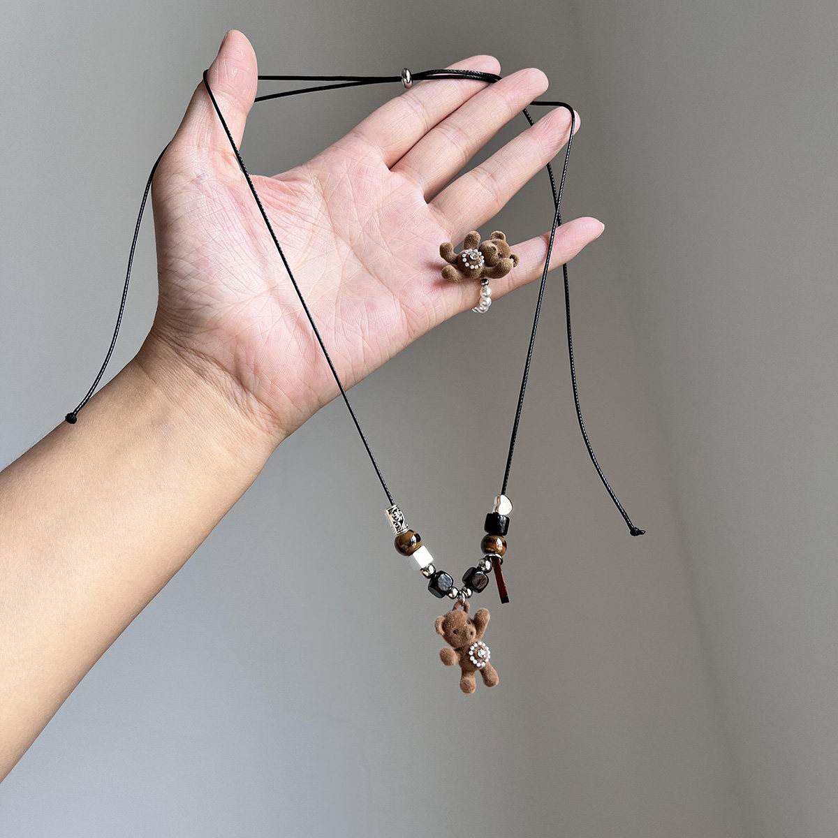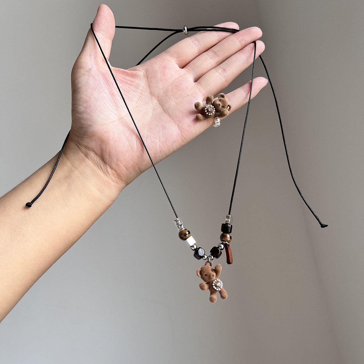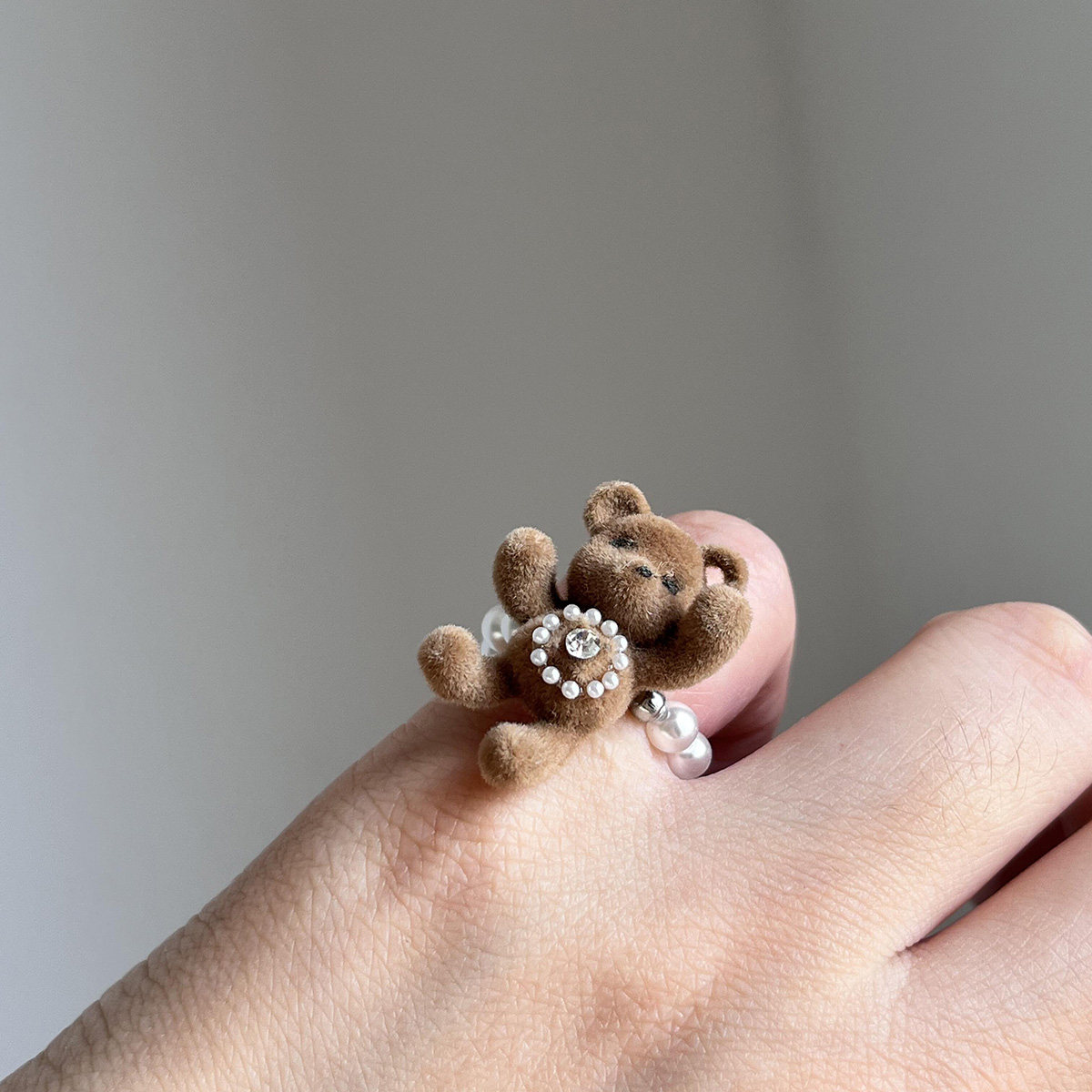 秋冬棕色植绒珍珠小熊吊坠项链戒指小众甜美童趣百搭锁骨链毛衣链