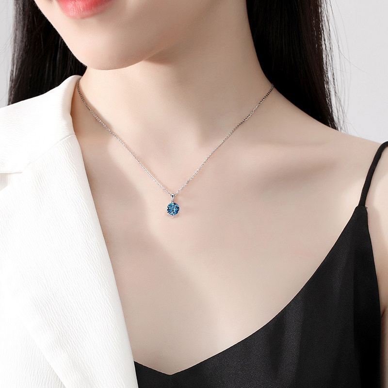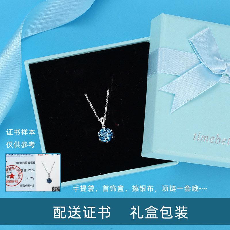 天然托帕石银项链女简约六爪轻奢伦敦蓝锁骨链送证书深蓝生日礼物