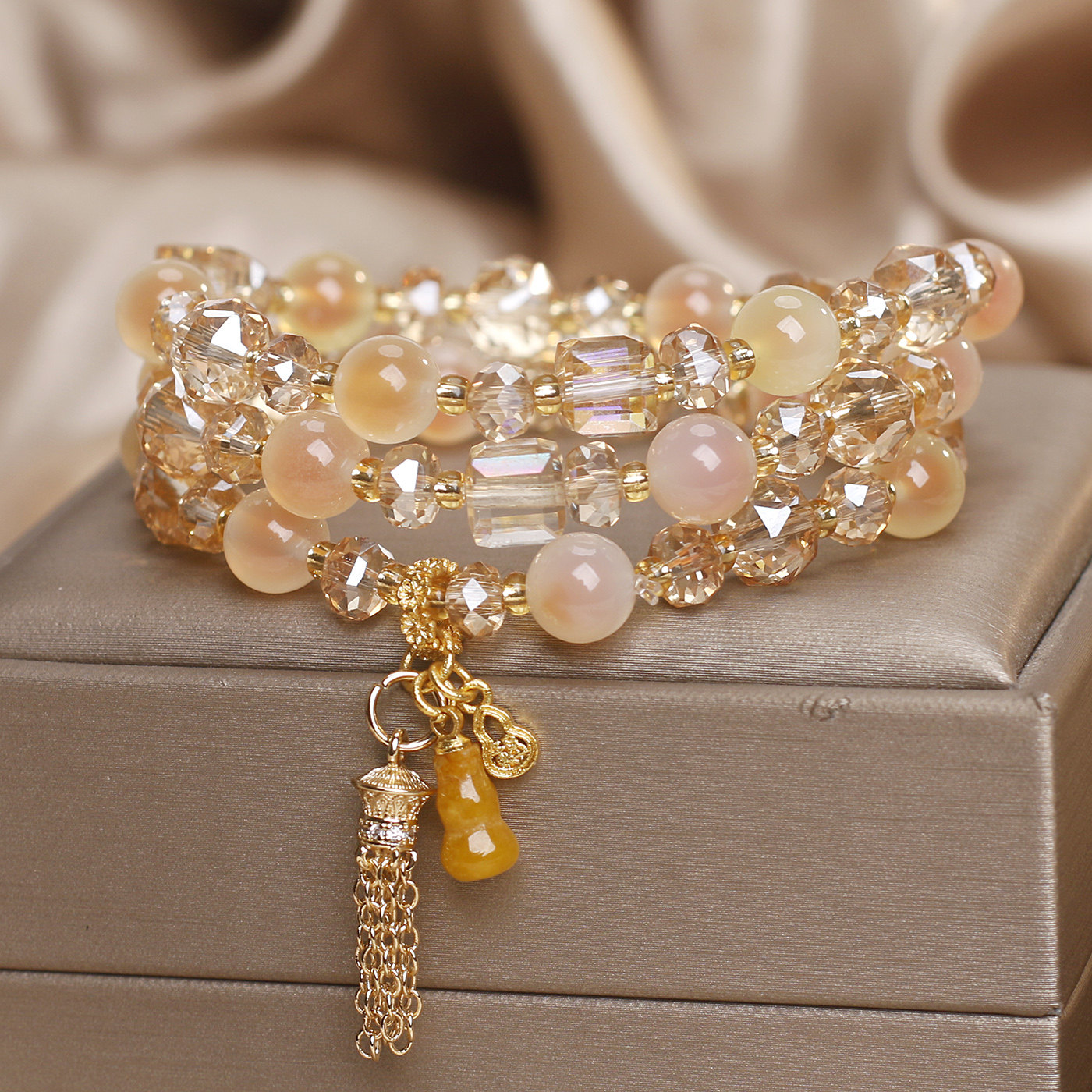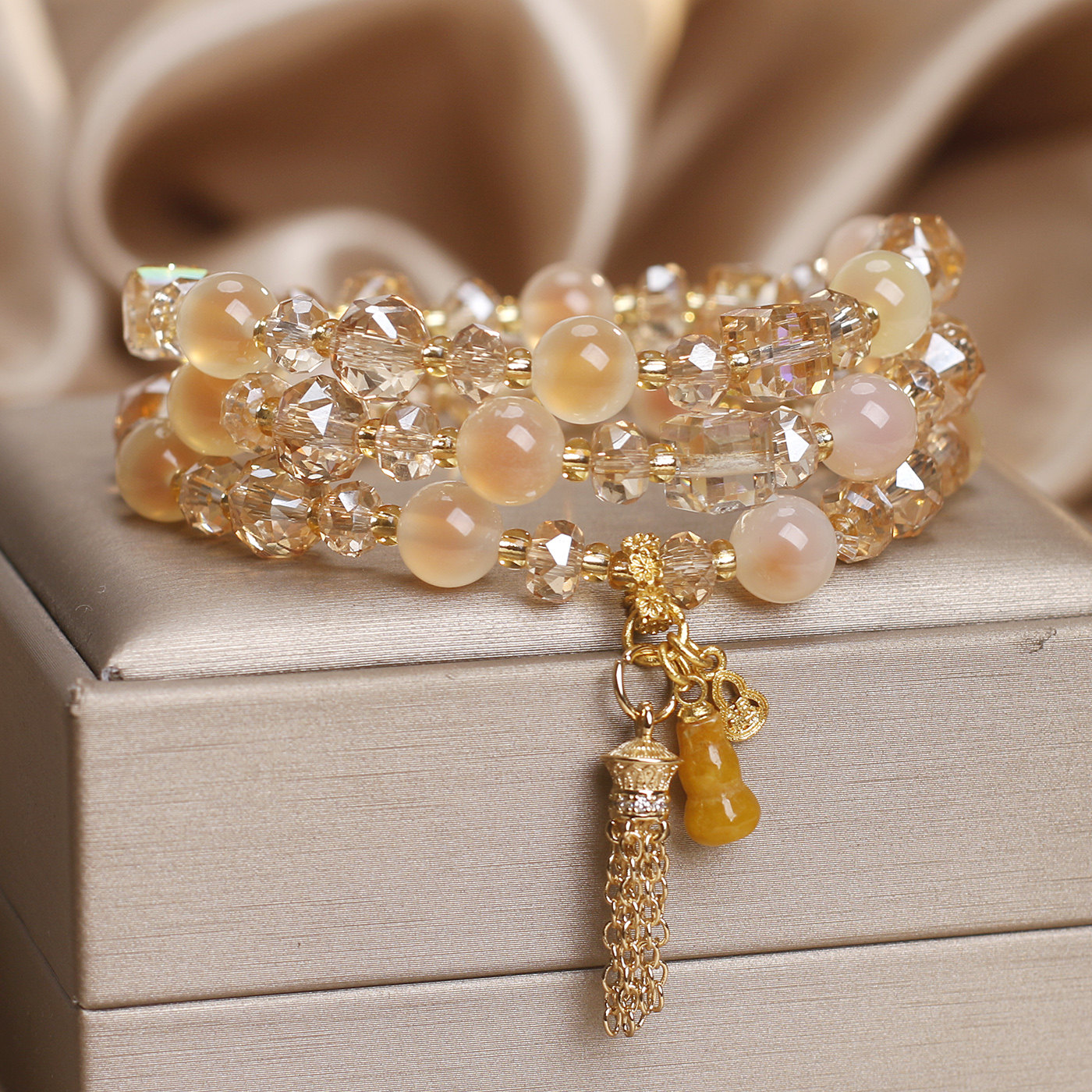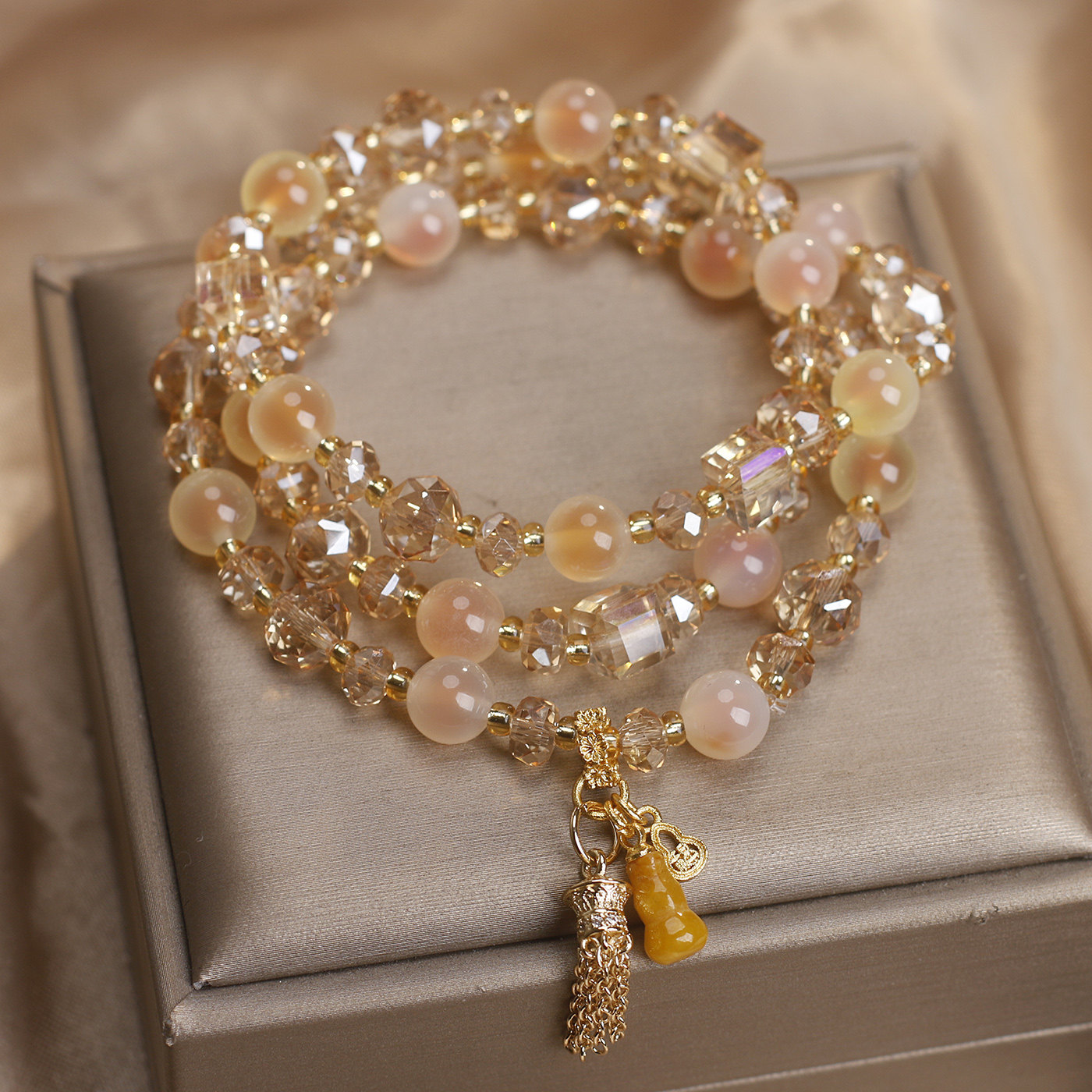 新款橙色糖心玛瑙多层手链女招财转运黄水晶葫芦流苏吊坠水晶手串