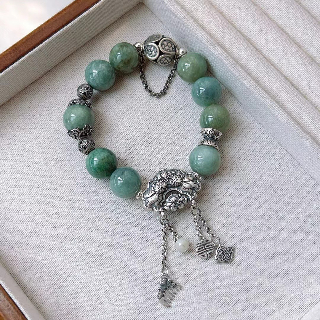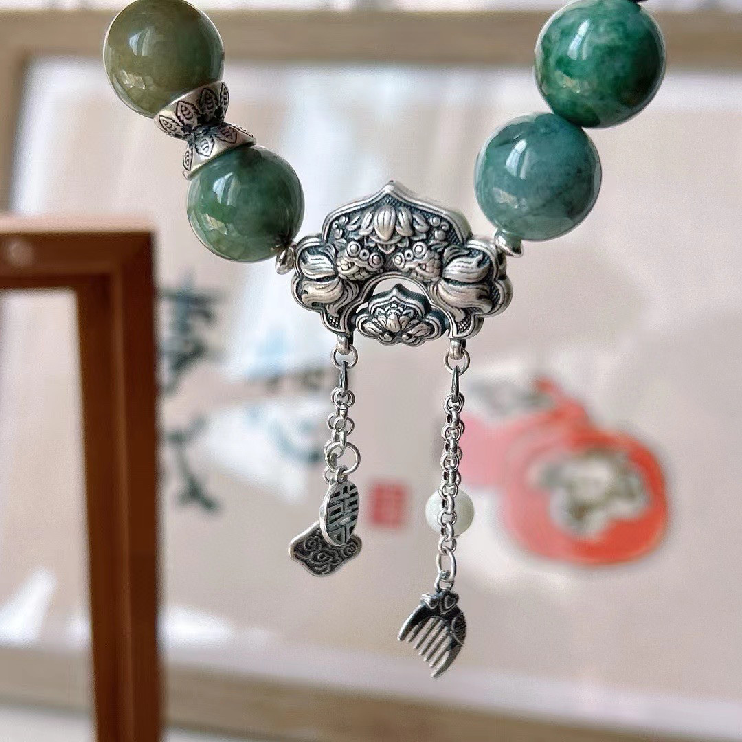 新款天然翡翠单圈手链999足银锁包银梳子手链原创设计古风复古款