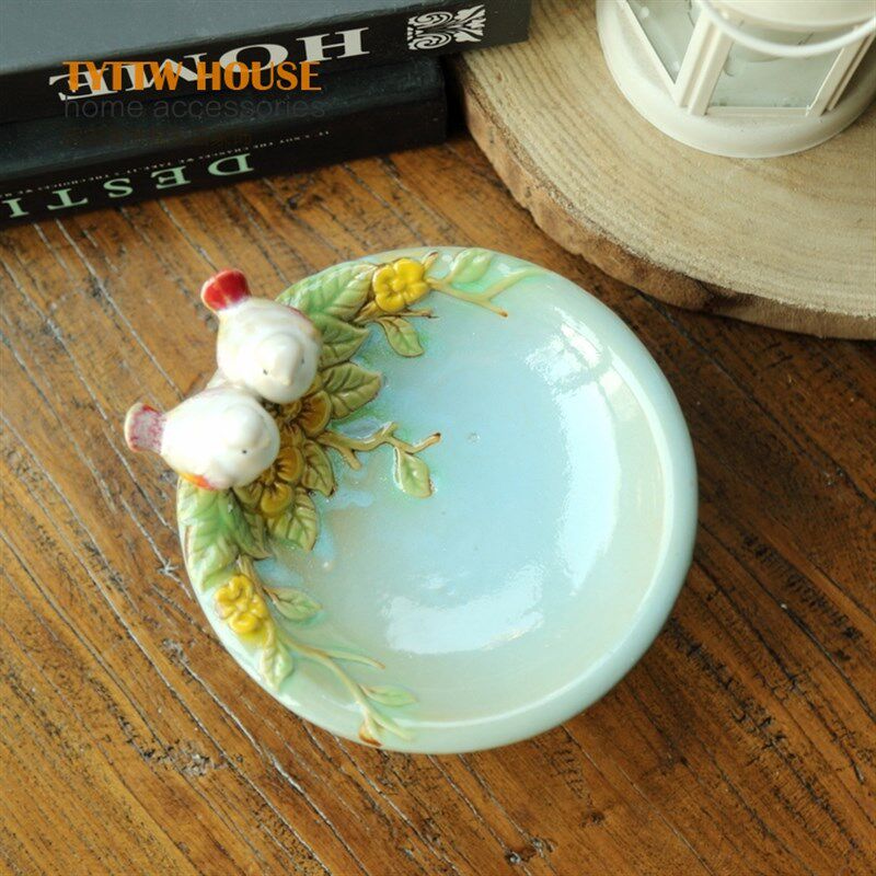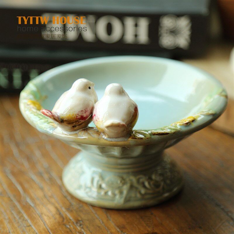 美式乡村 陶瓷釉面 浅蓝色对鸟花朵摆件 果盘肥皂摆件