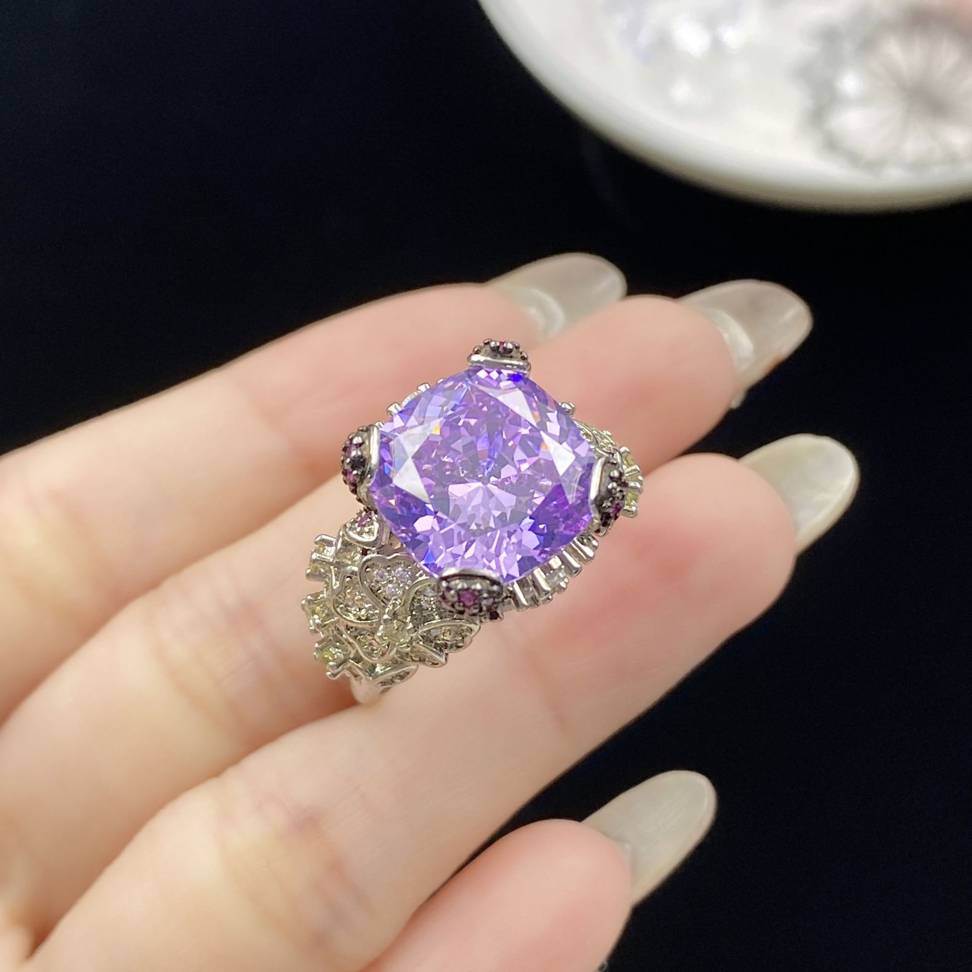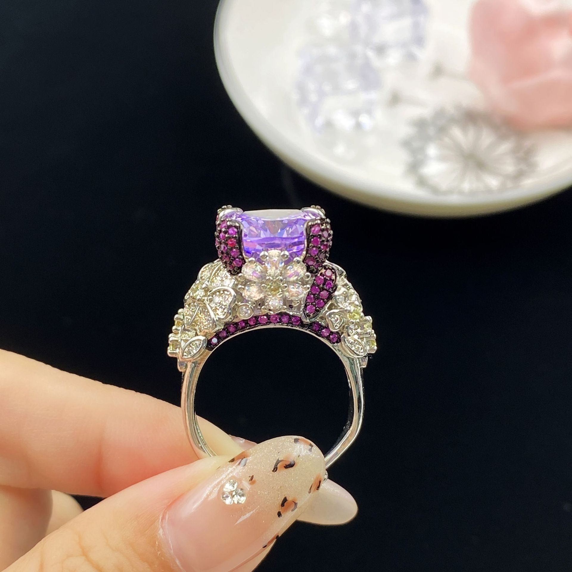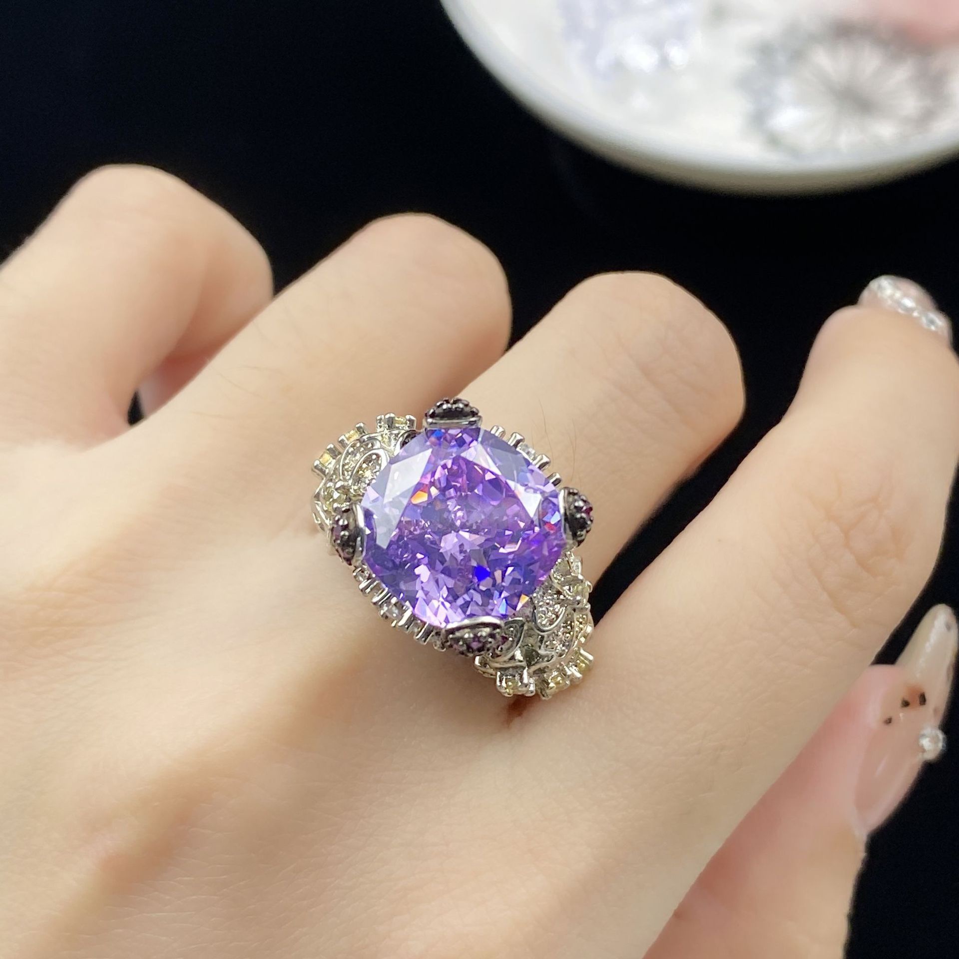 S925银高定重工鸟巢切紫锂辉荧光灯变色满钻戒指气质时尚奢华指环