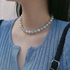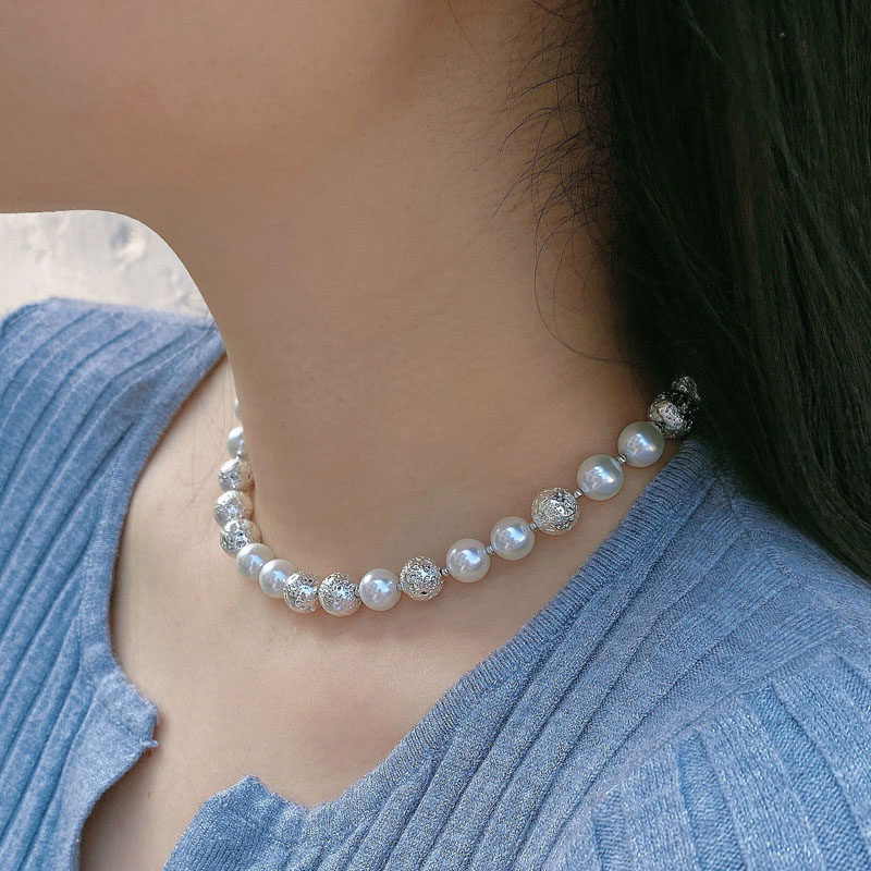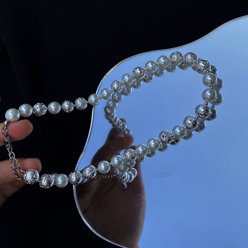珍珠银色球球拼接间隔闪钻项链法式复古串珠时尚锁骨链颈链潮配饰