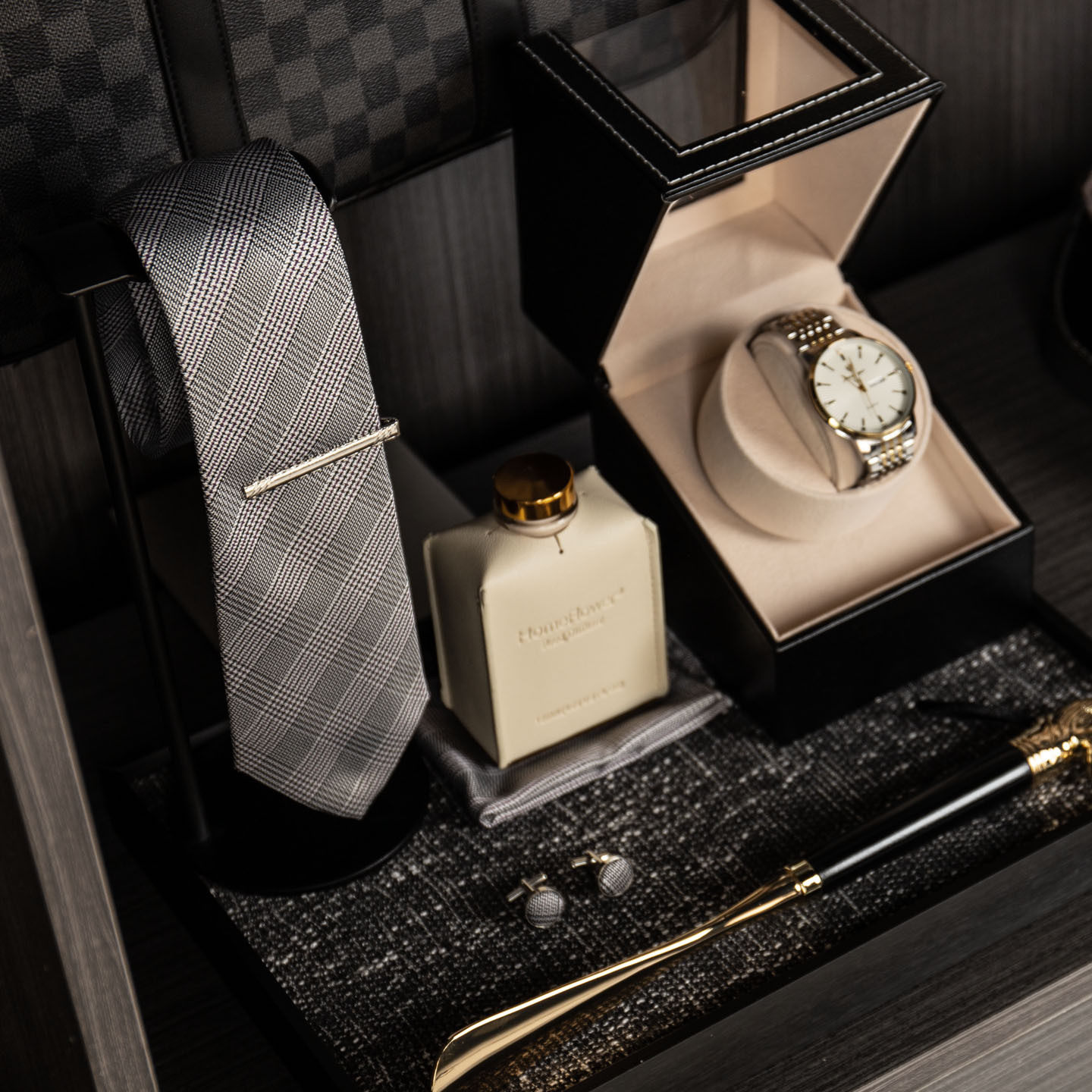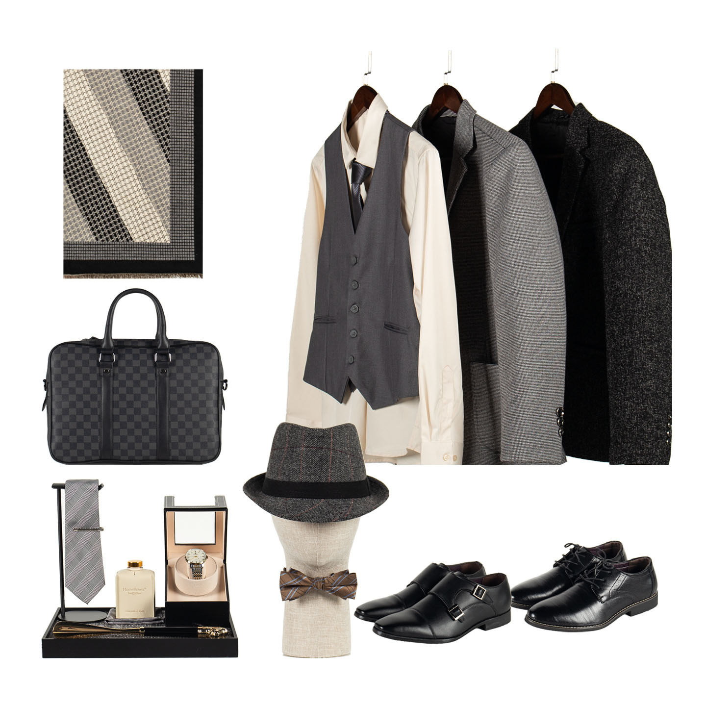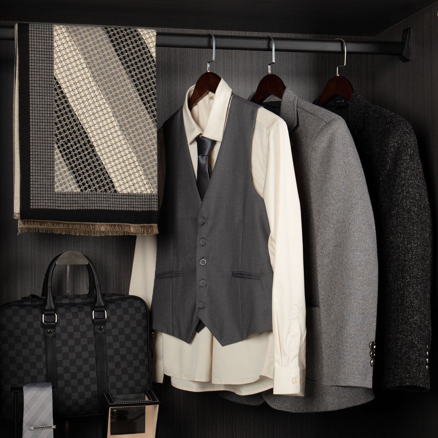老钱风灰色系意式衣帽间套装男士西装马甲衬衫领带皮鞋样板房