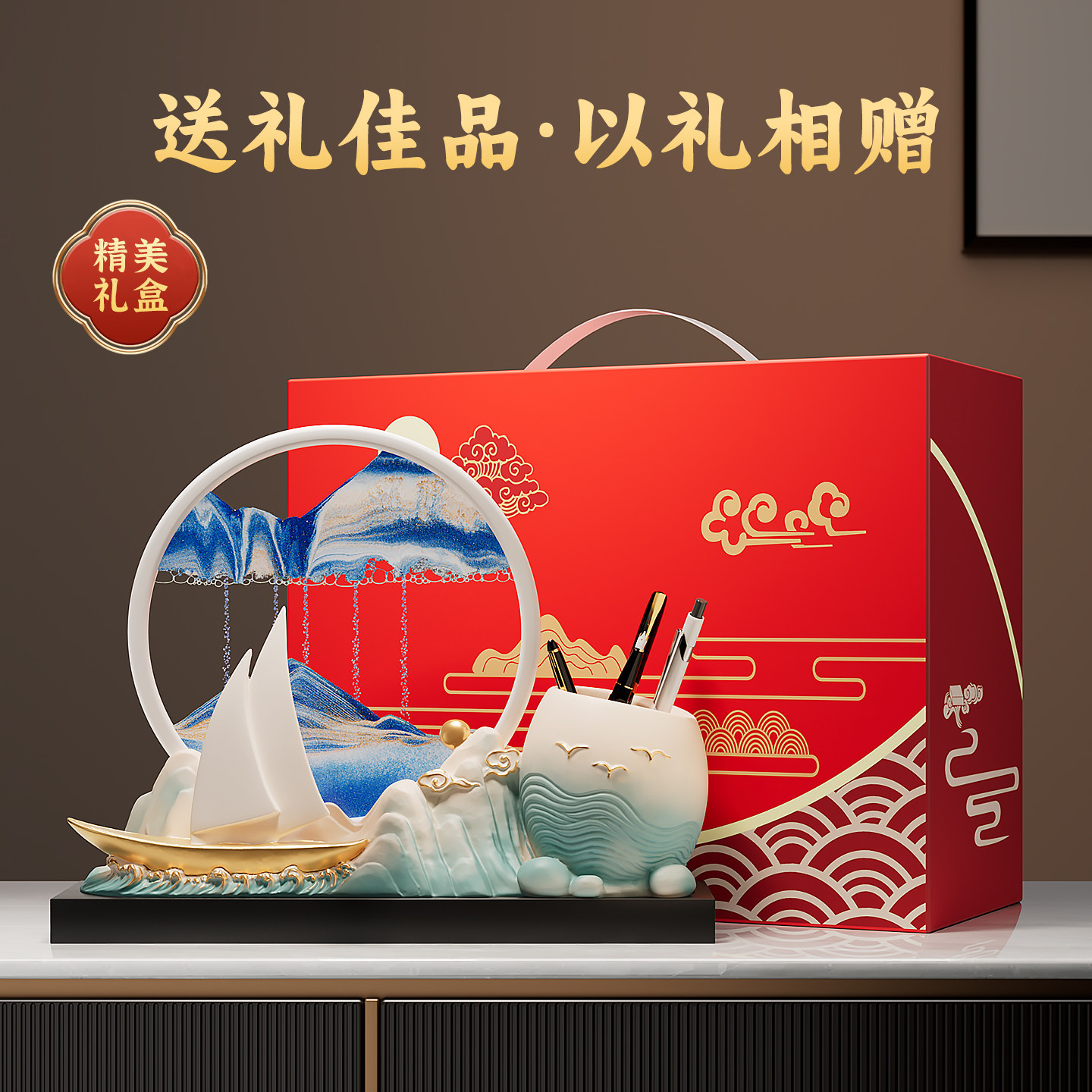 一帆风顺帆船笔筒摆件流沙画客厅招财办公室桌面创意礼物2026新款