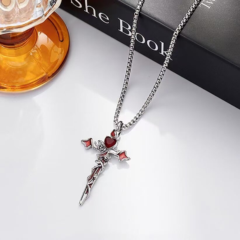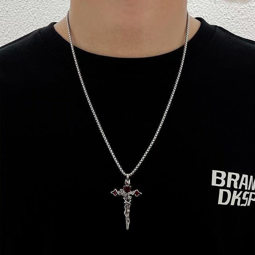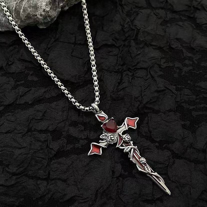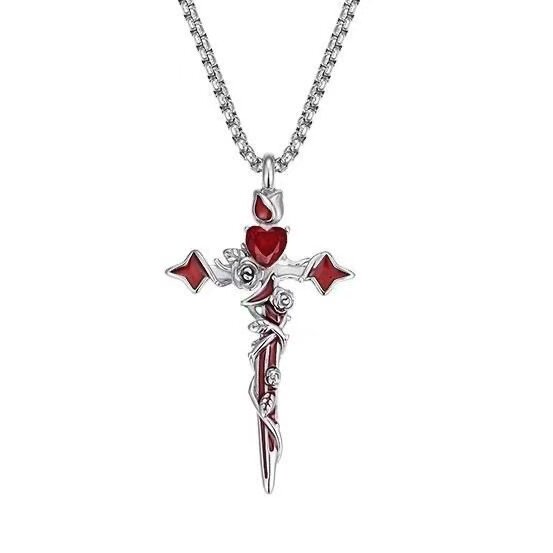 新款红色爱心荆棘玫瑰十字架项链小众男女高级感百搭暗黑复古吊坠
