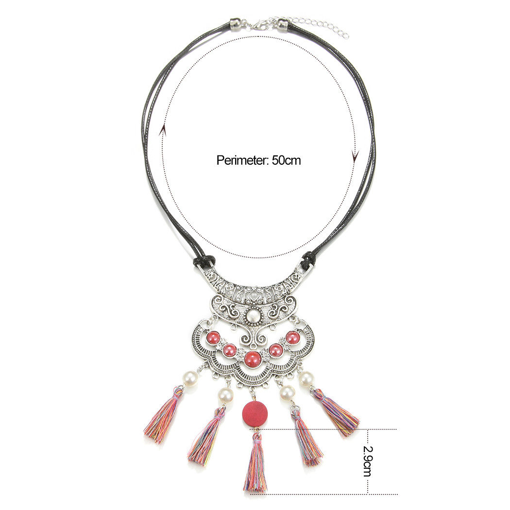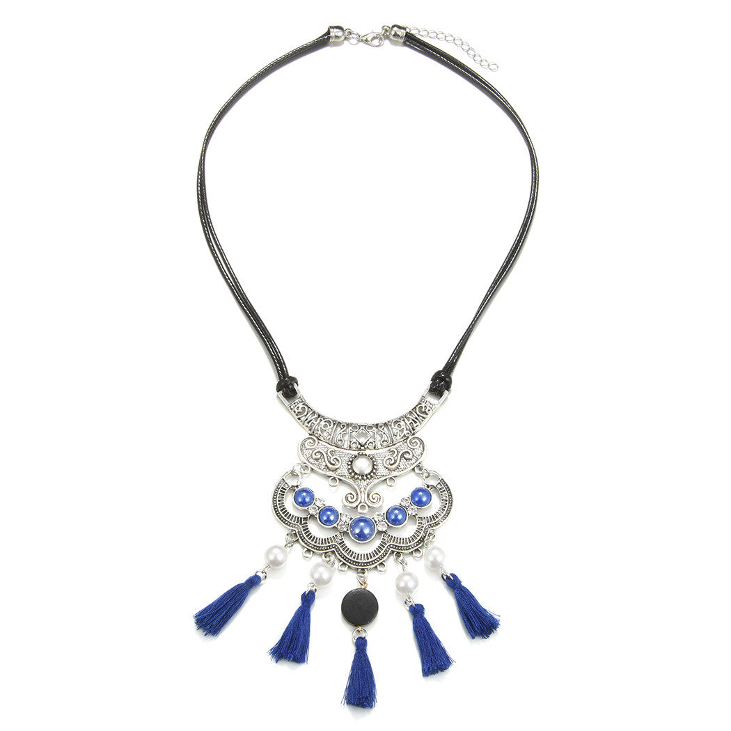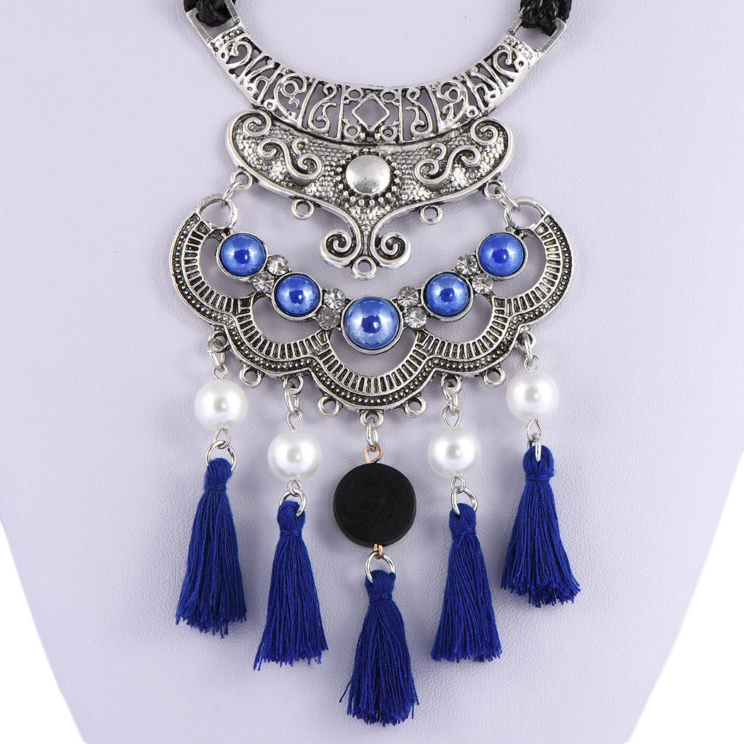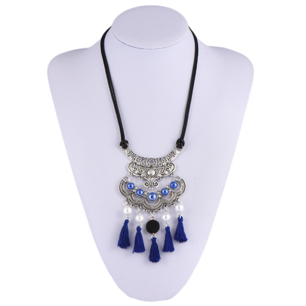 民族风复古藏银项链蓝色流苏珍珠锁骨链波西米亚风小众设计感颈链