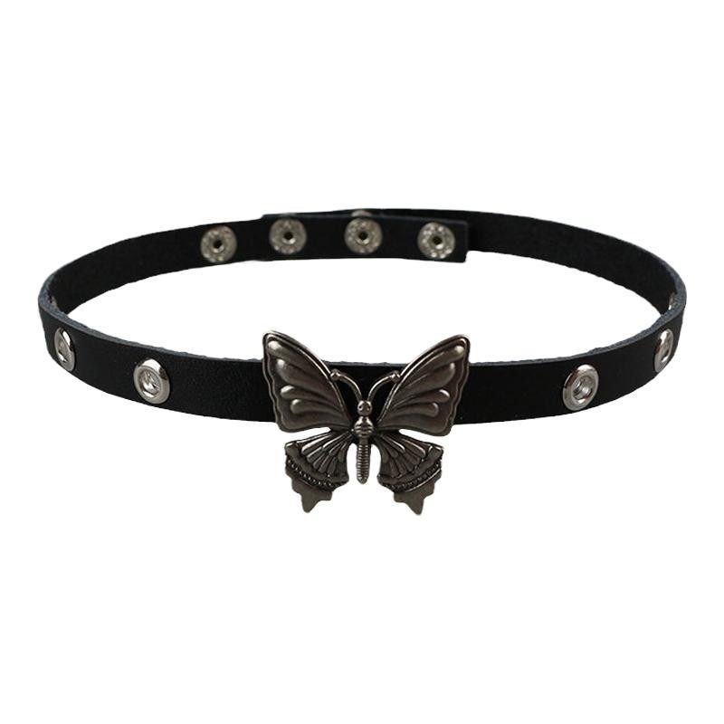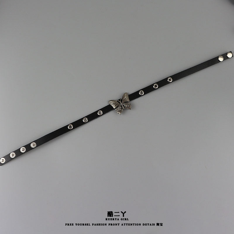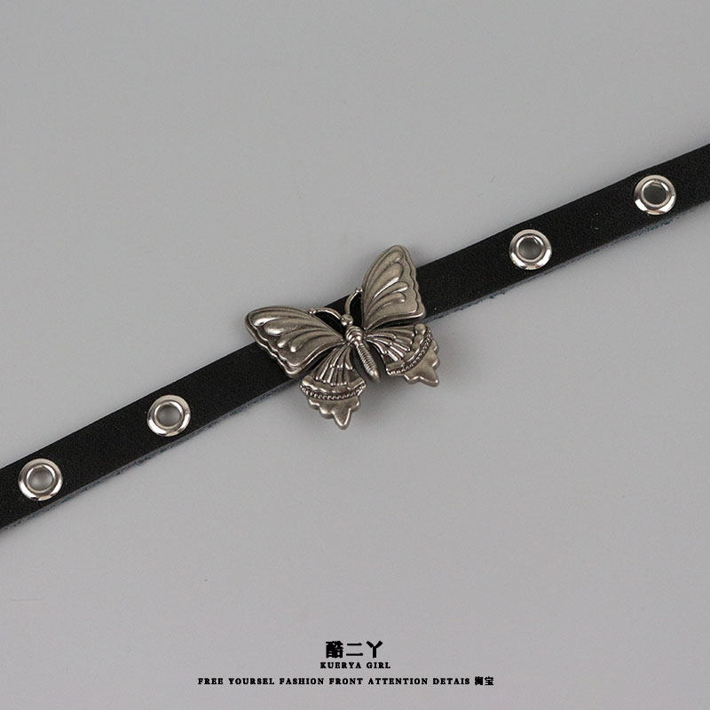 酷二丫Y2k辣妹蝴蝶choker颈链黑色小众朋克少女皮革项圈锁骨颈带