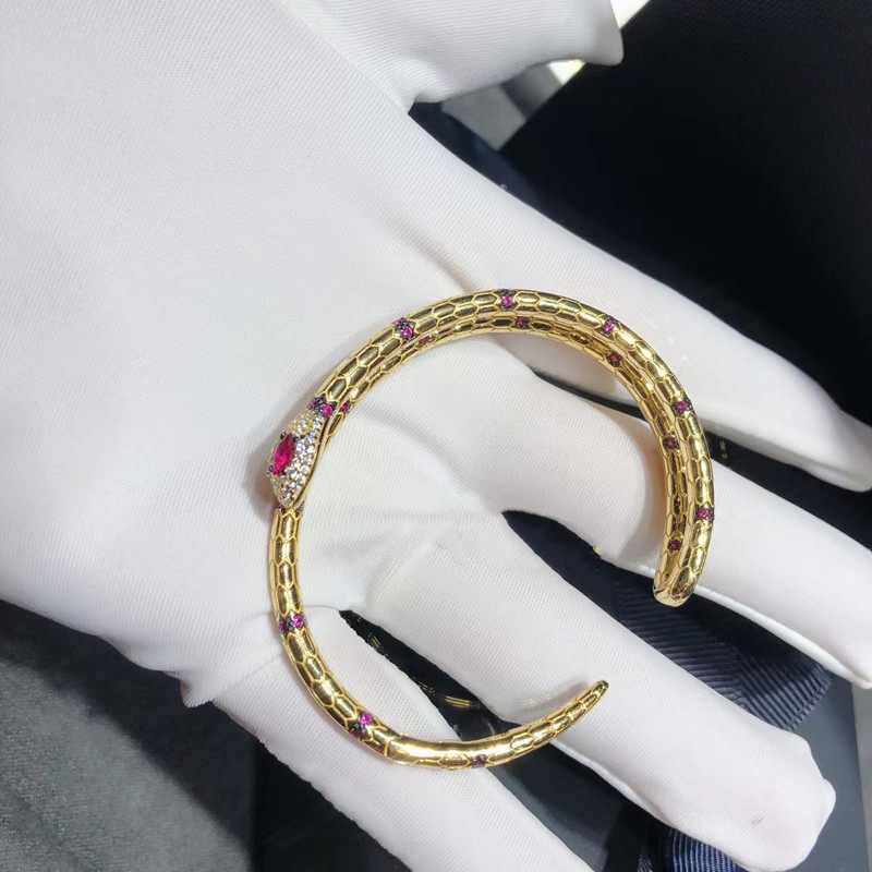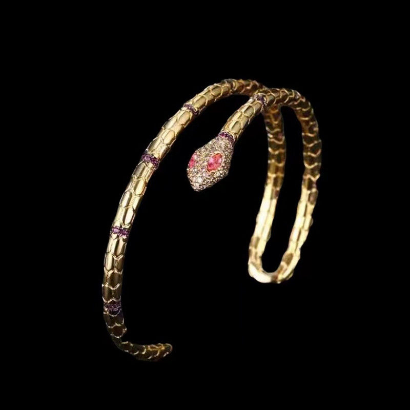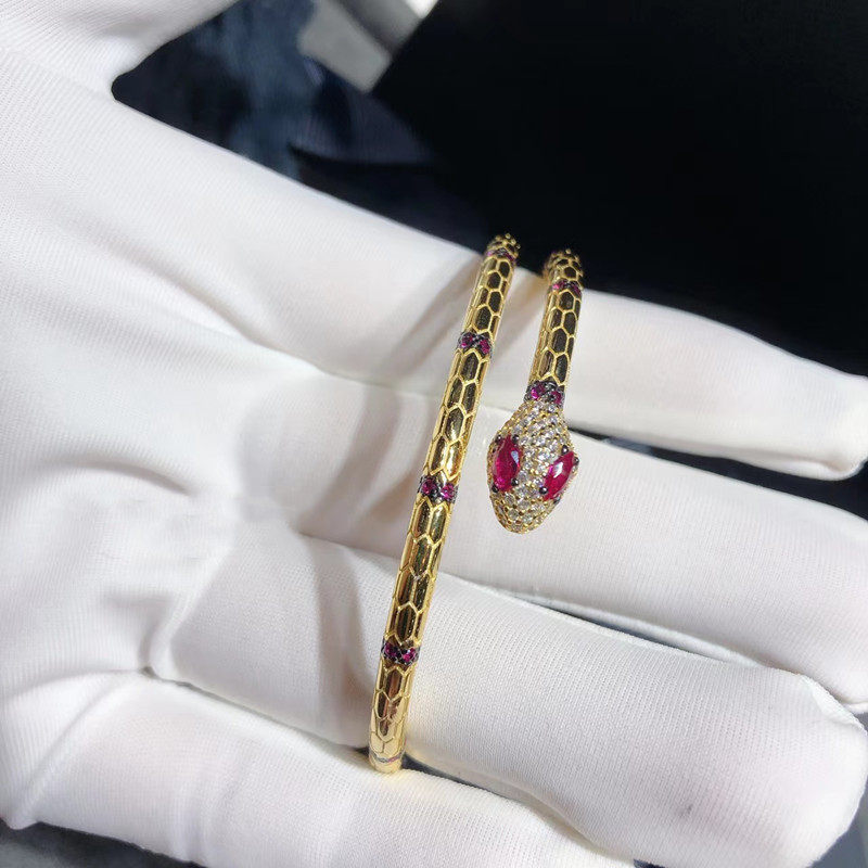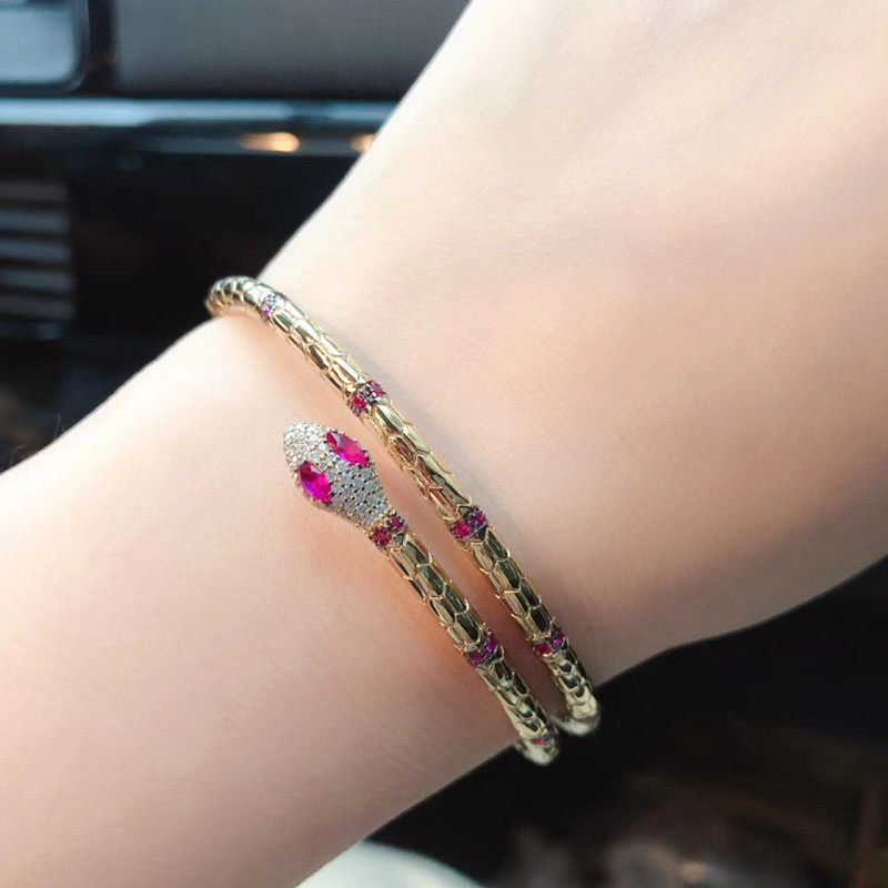 金黄色双层开口红刚玉蛇型手镯女S925银时尚流行灵蛇手环大气手饰