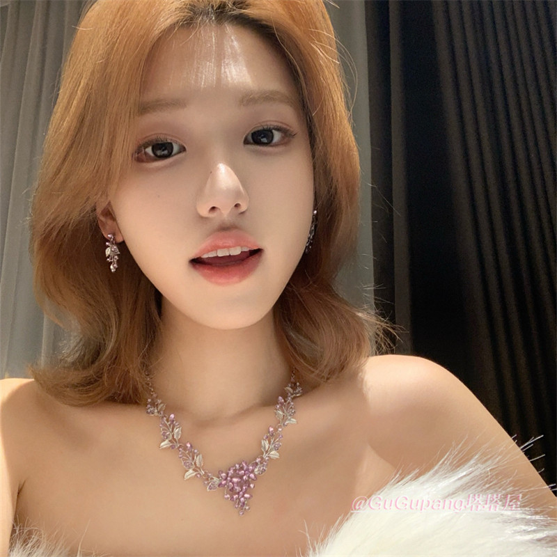 重工紫色花朵锆石项链耳饰套装贵气名媛晚礼服锁骨链女高级感耳环