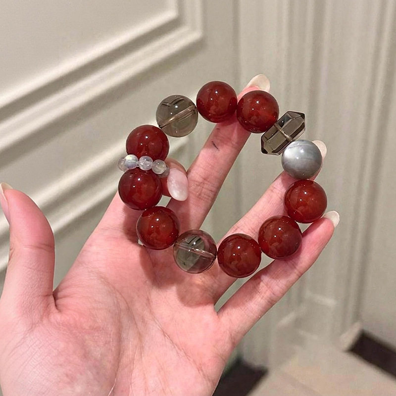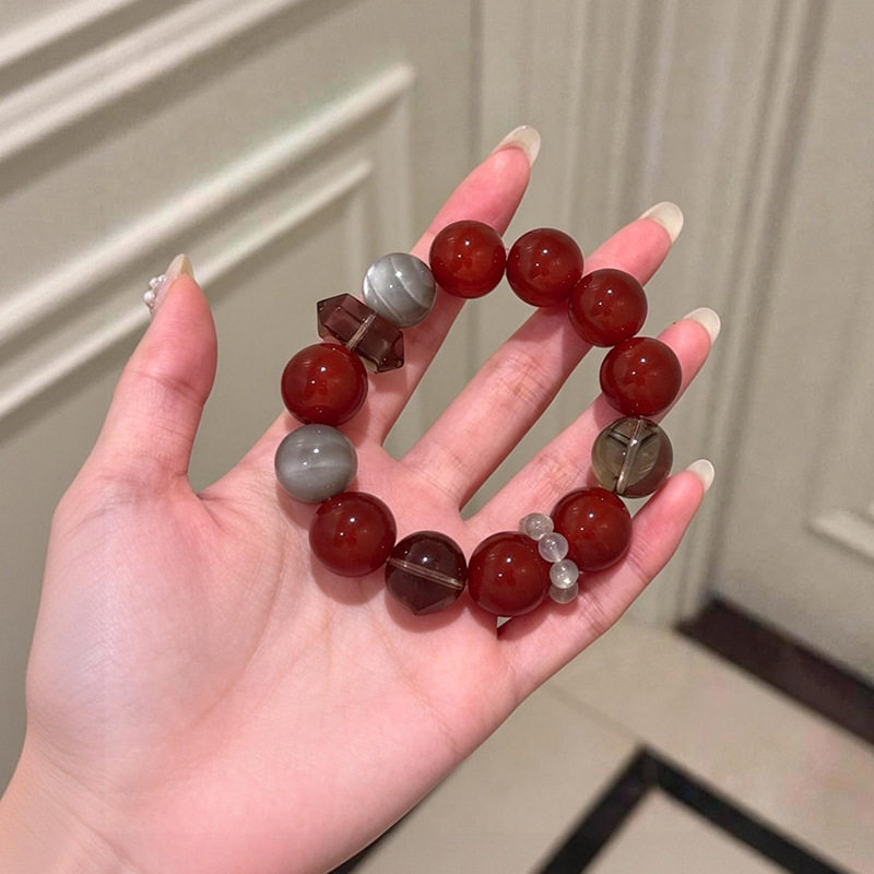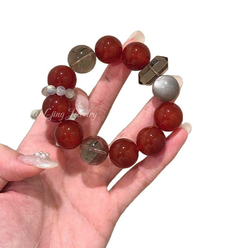 天然茶晶银曜石红玛瑙水晶手串大点位串珠手饰女红色新年手链礼物