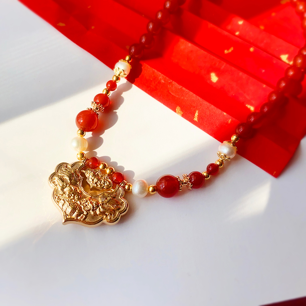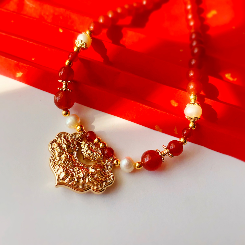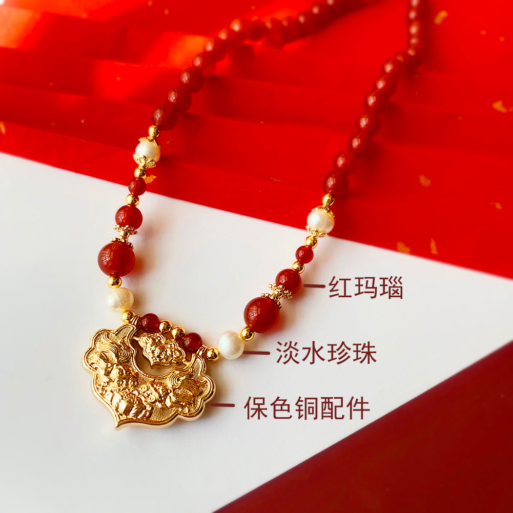 新年贺岁原创明制淡水珍珠红玛瑙如意锁儿童璎珞项链