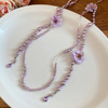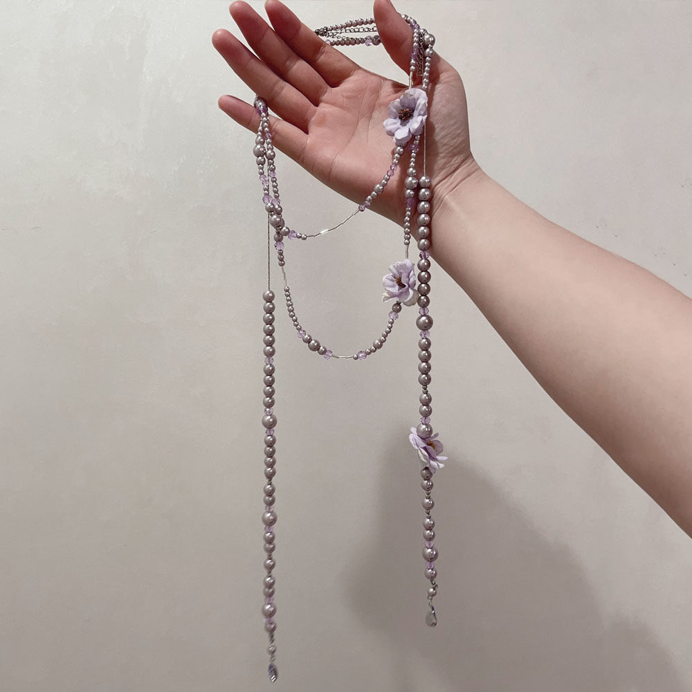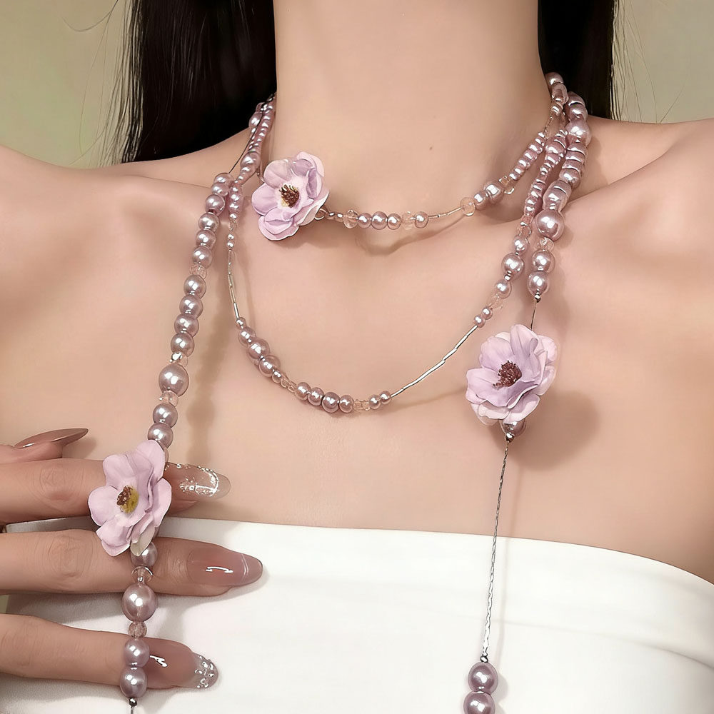 法式浪漫风紫色花朵珍珠水晶叠戴项链女长款多层锁骨链流苏毛衣链
