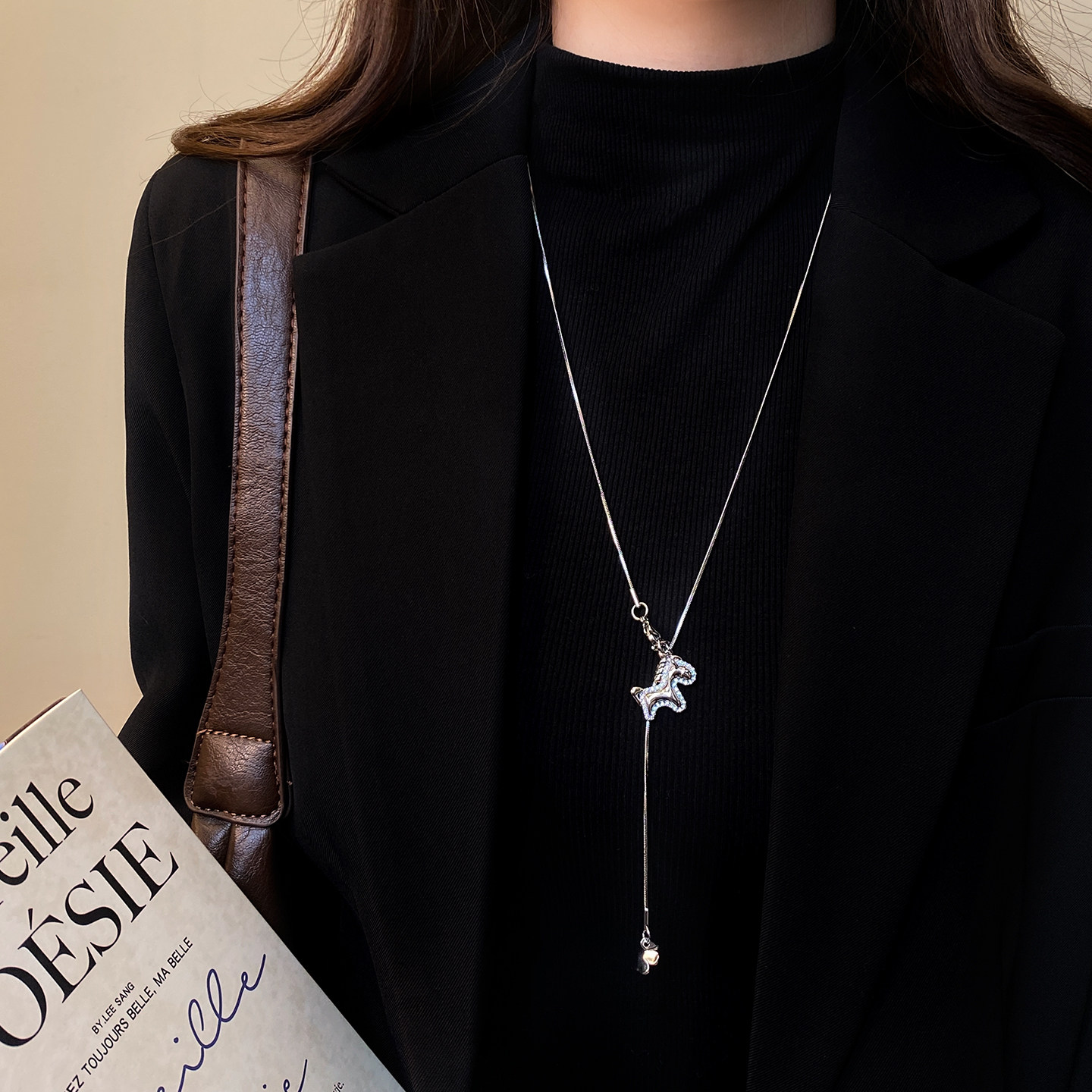 银色小马吊坠长款项链女秋冬毛衣链大气高档高级感轻奢脖子配饰品