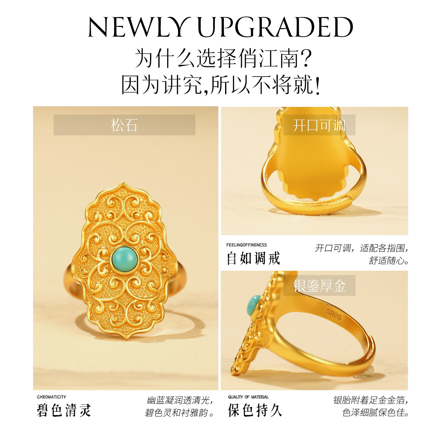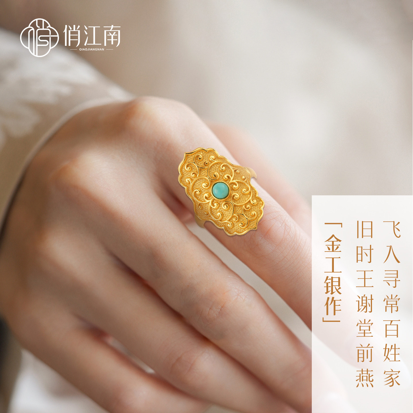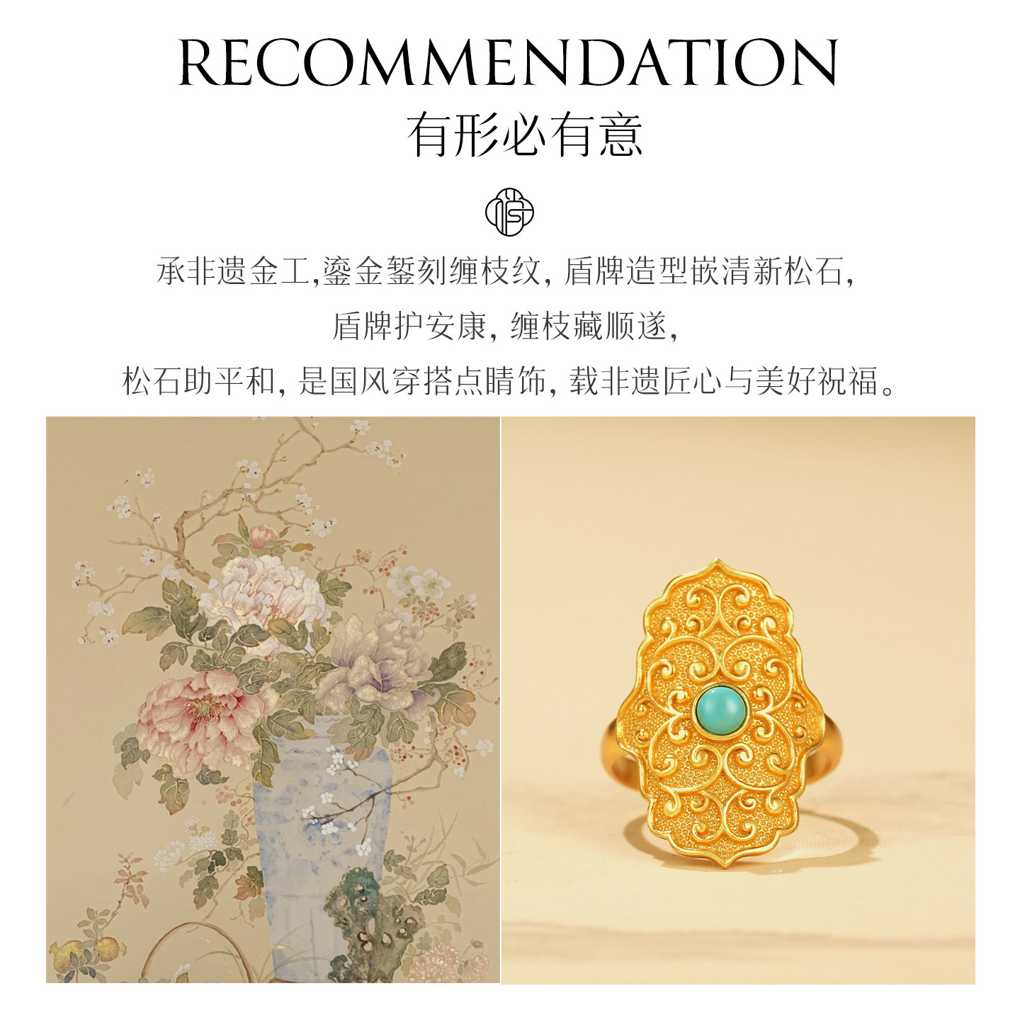 花盾缠枝纹银鎏金盾牌戒指非遗花丝錾刻松石文物复刻新中式银指环