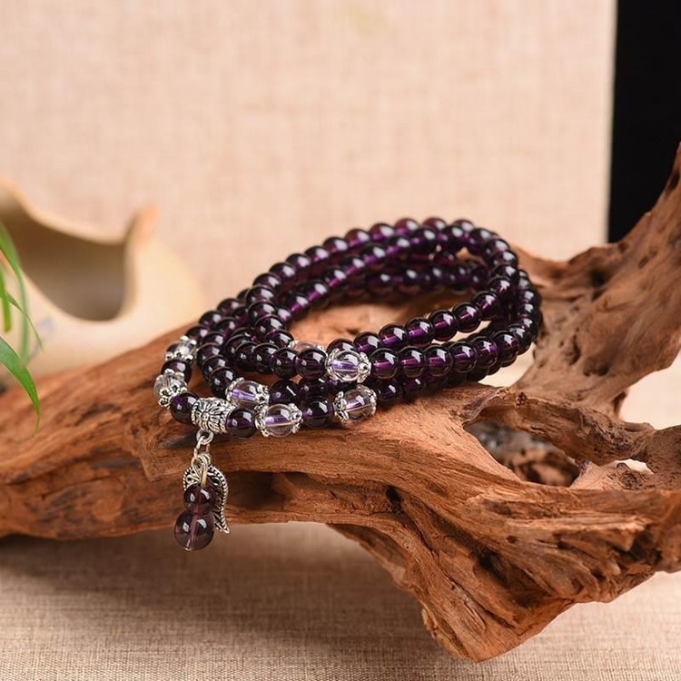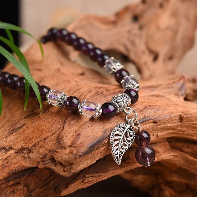 紫色水晶手链藏银树叶绕手四圈多层手串女圆珠项链挂坠毛衣链男女