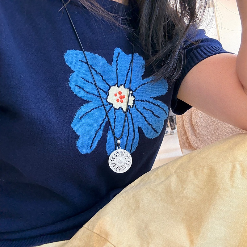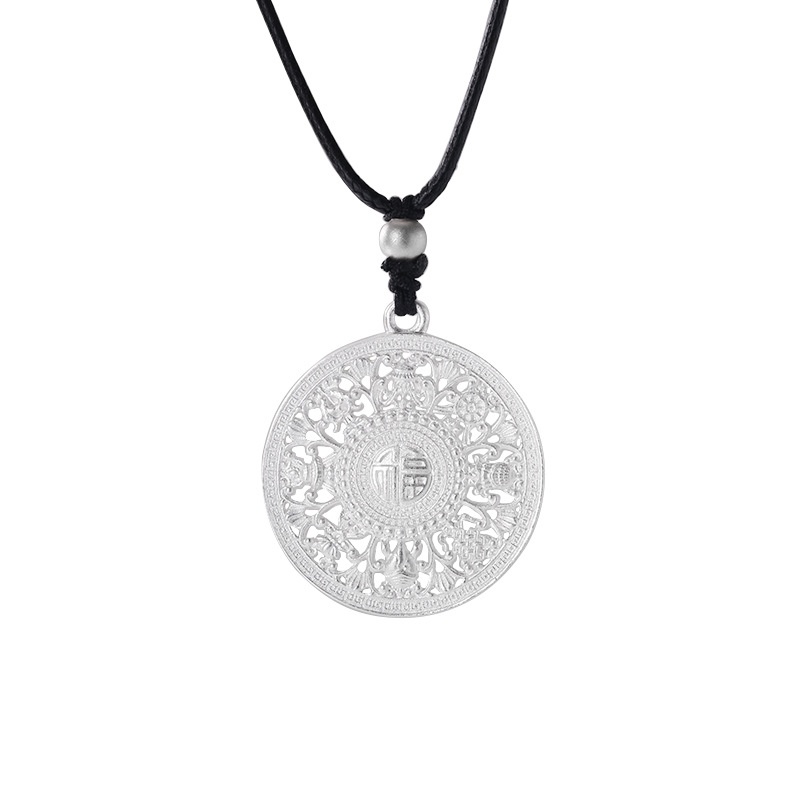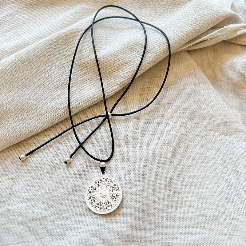 美汝仙 纯银八宝罗盘项链女秋冬款新中式设计黑色皮绳毛衣链轻奢