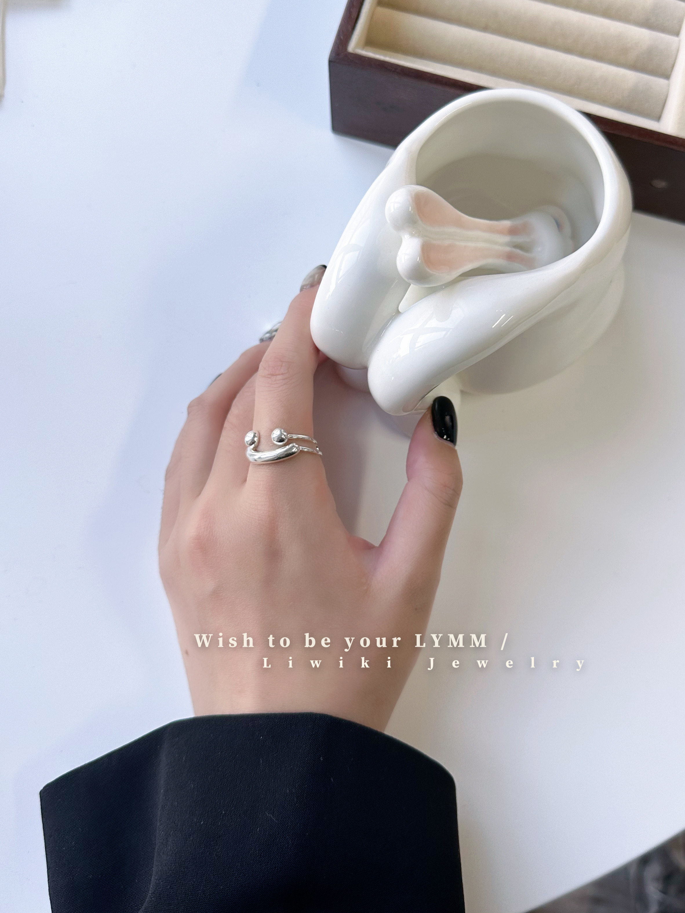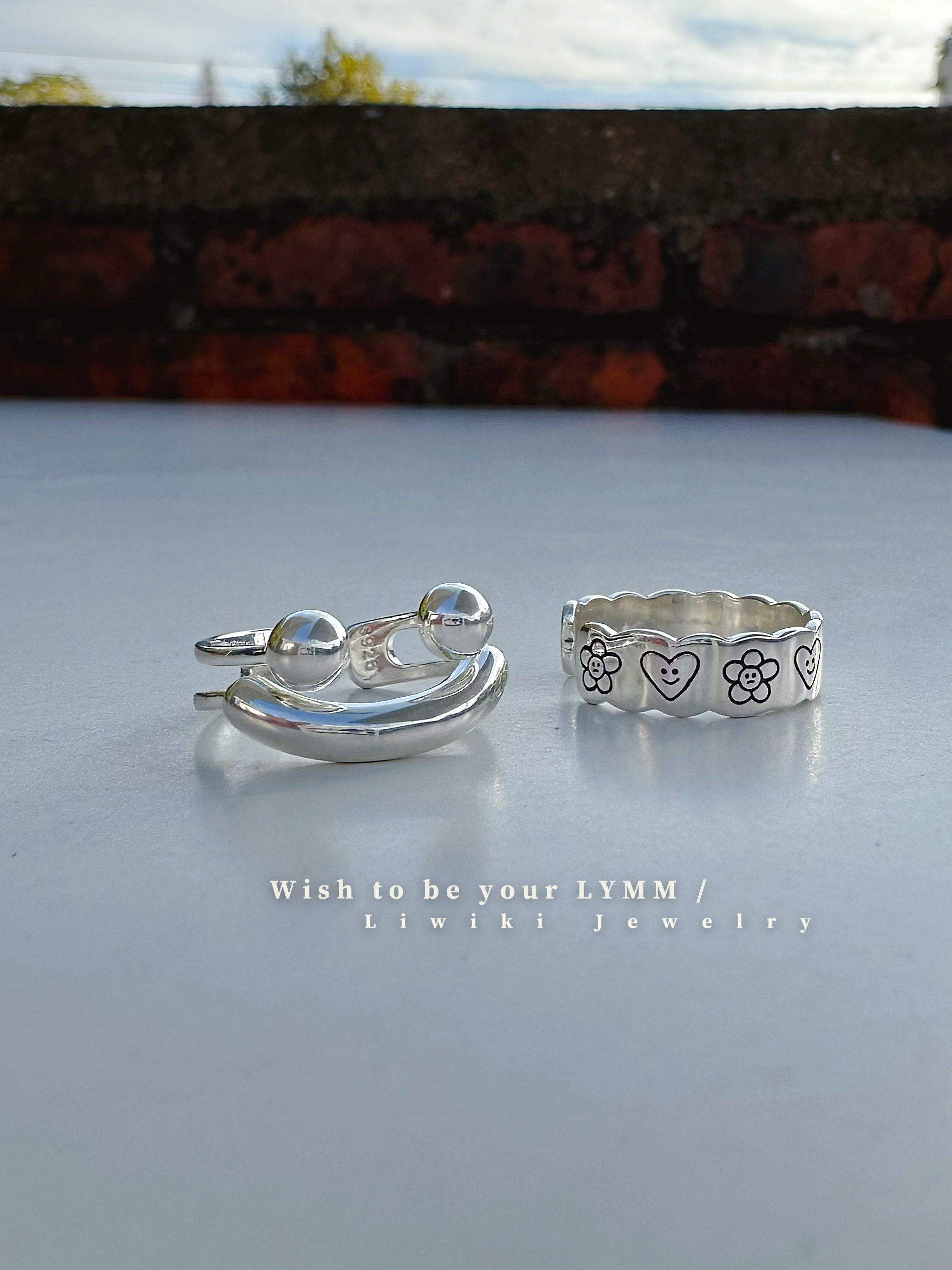 Liwiki通体纯银戒指女笑脸圆球925银小众设计感可爱涂鸦开口调节