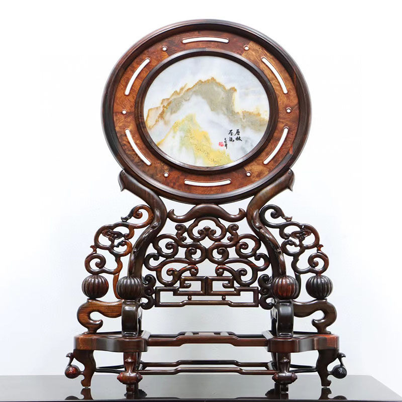 红木台屏座屏酸枝天然石画圆屏纯实木复古中堂高档圆形大红