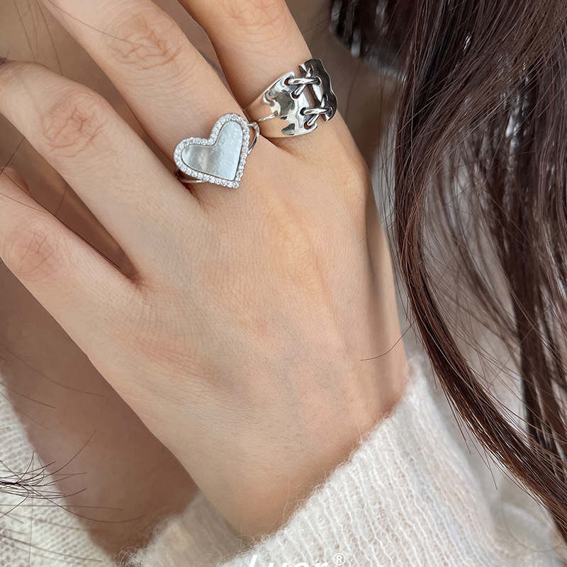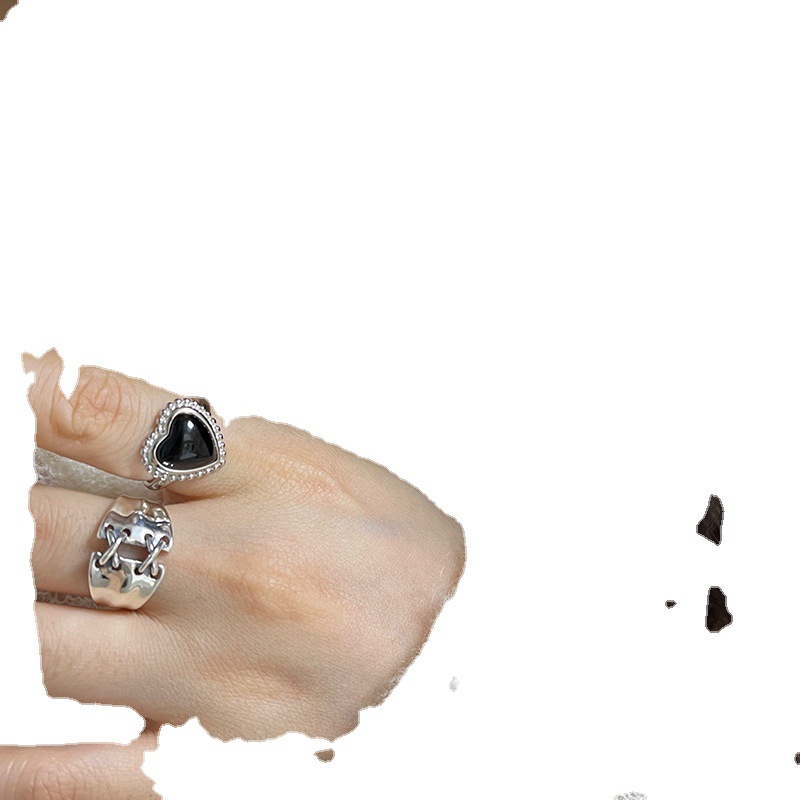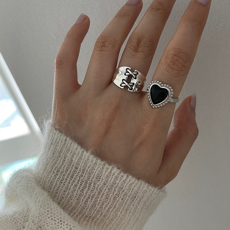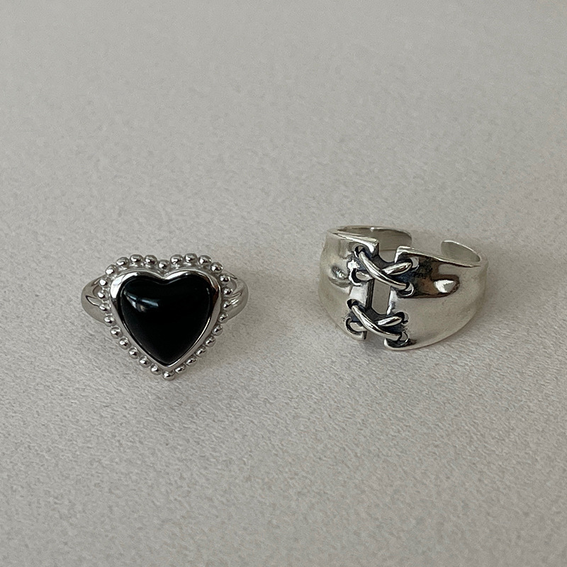 【两件包邮】甜酷黑色爱心戒指女复古时尚重工绑带个性S925镀银开