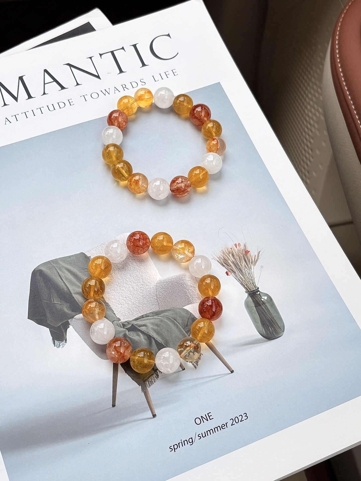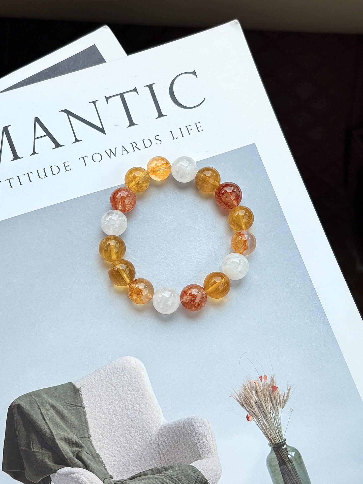 【暮色沙滩】原创天然黄胶花黄萤石红胶花雪花幽灵黄色系水晶手串