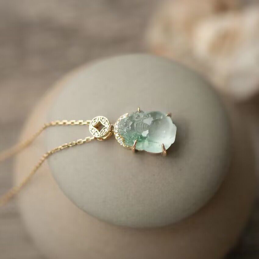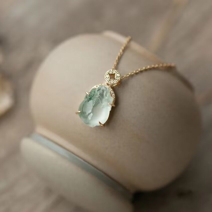 新中式玉髓冰种飘花小金蟾玉髓镀18K金镶嵌铜钱吊坠项链水润饱满