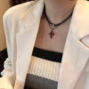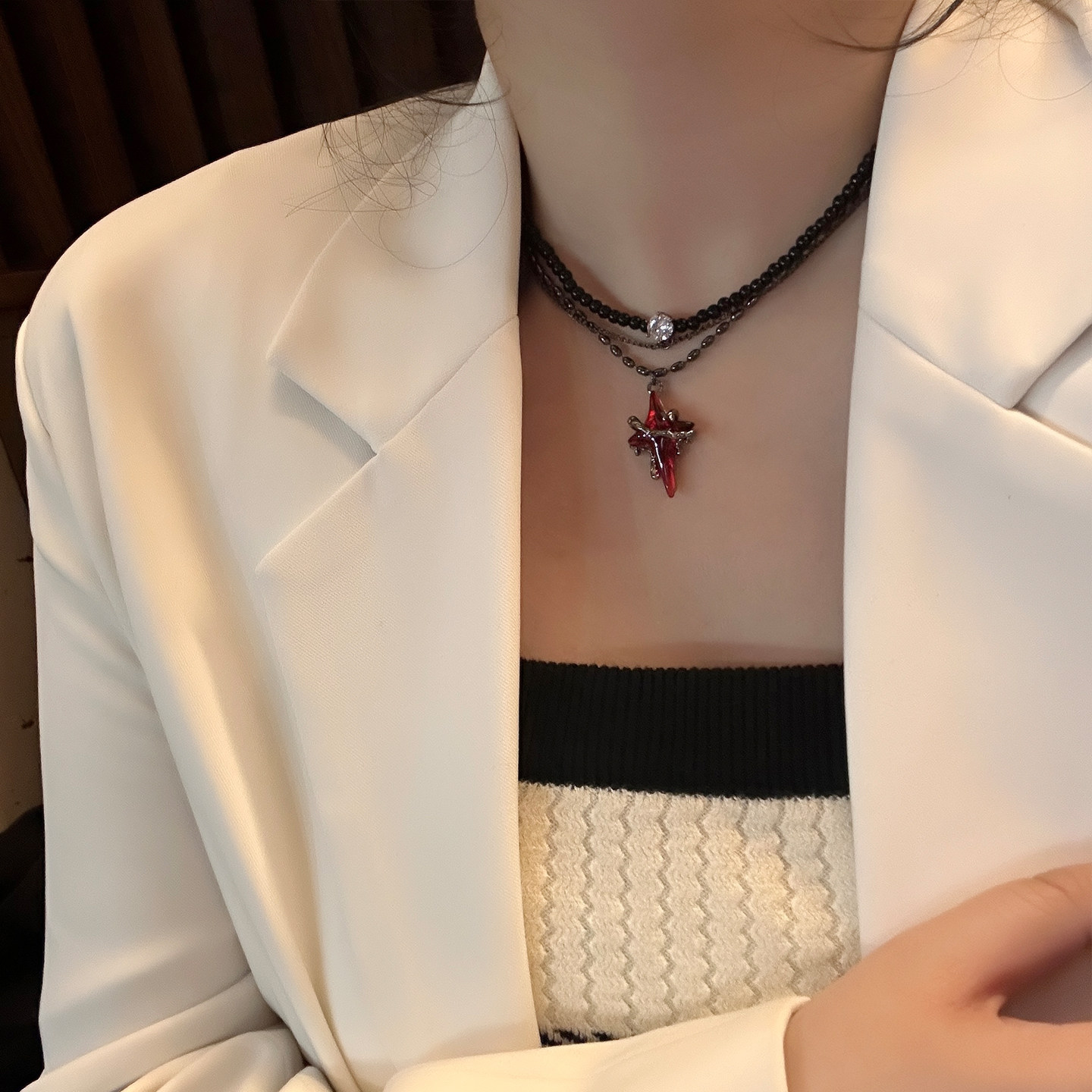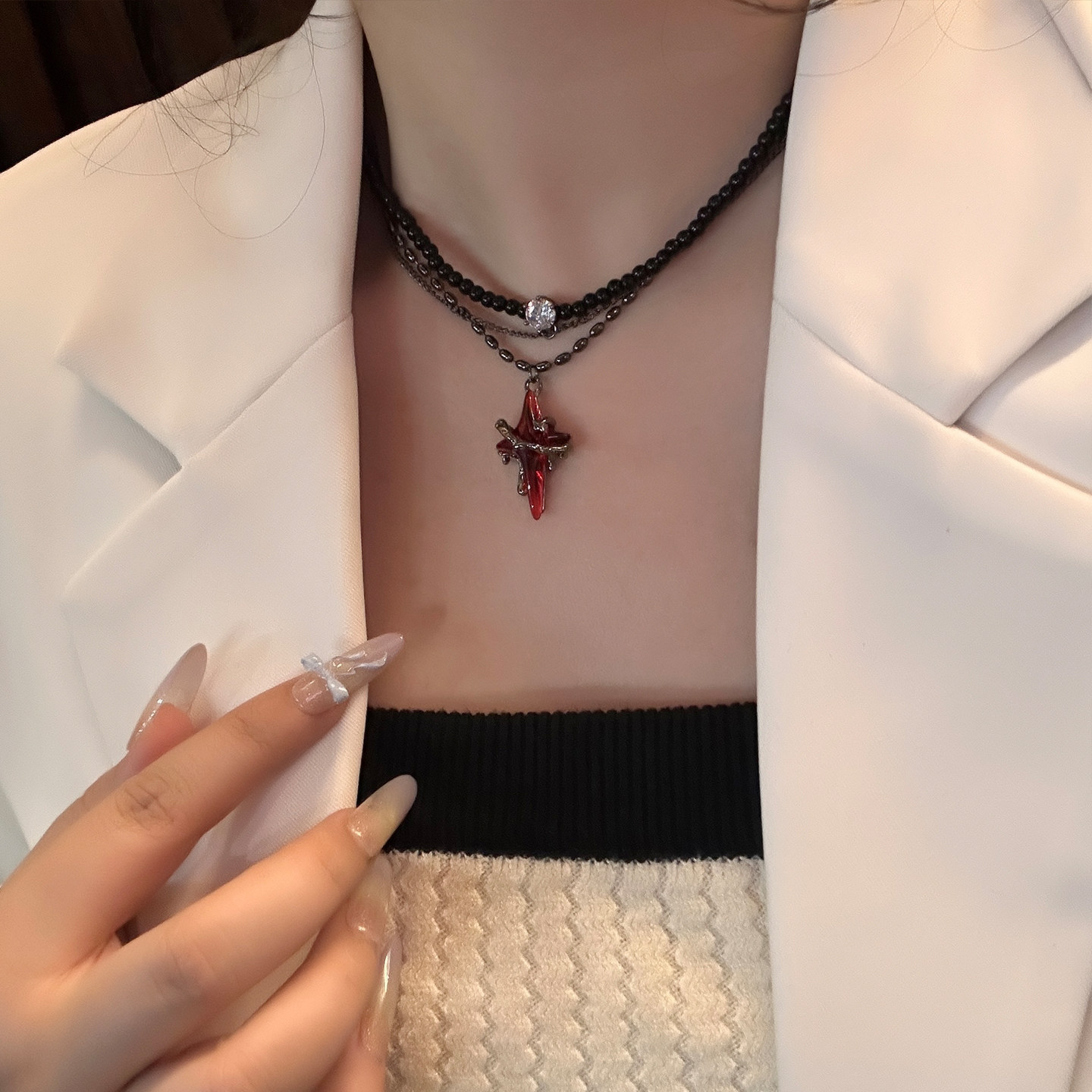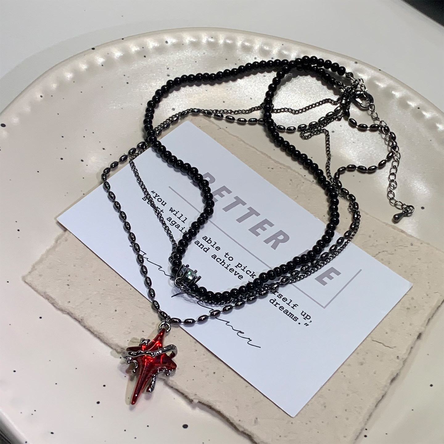 甜酷辣妹风黑色串珠红色星芒吊坠项链个性独特锁骨链双层叠戴颈链