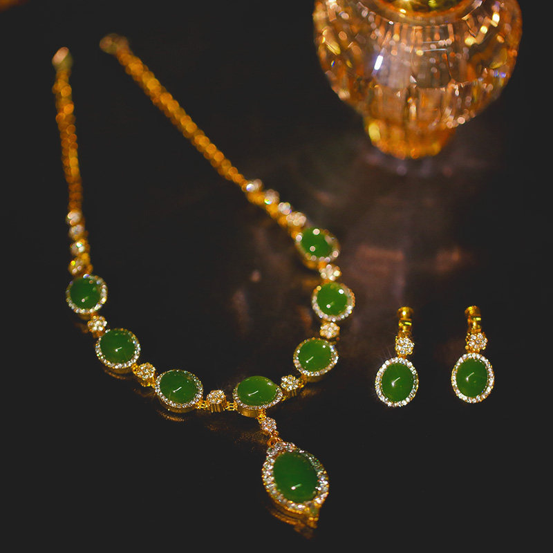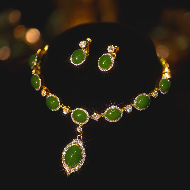 金钻新娘配饰新款绿宝石项链耳环套装秀禾服水钻锁骨复古结婚配饰