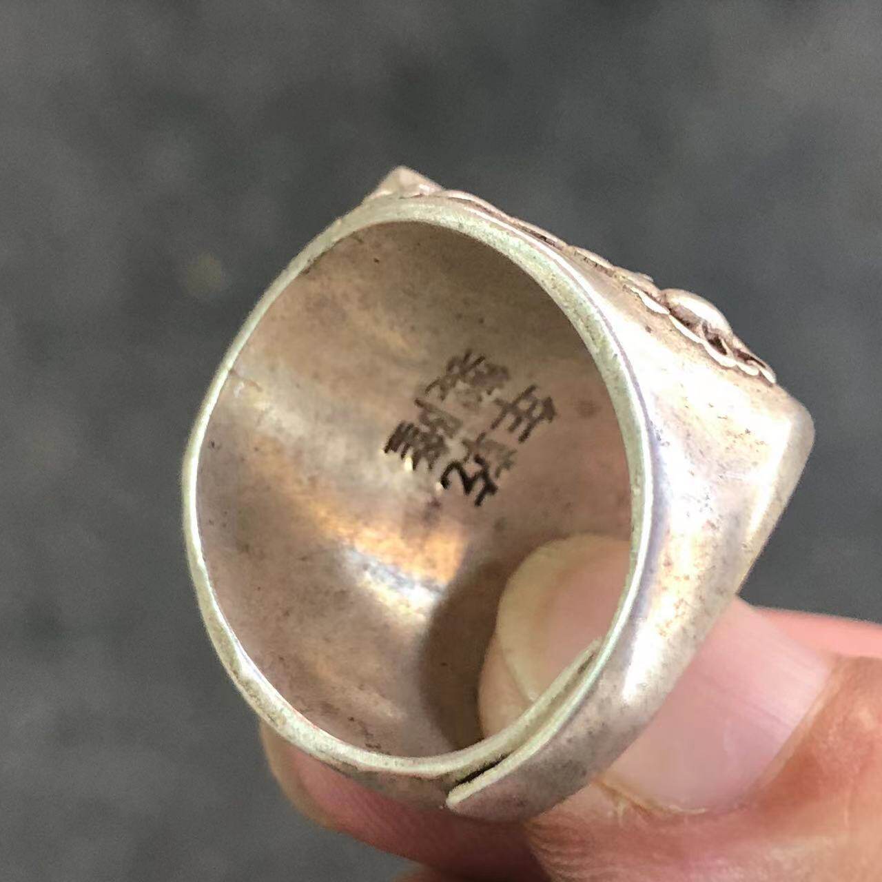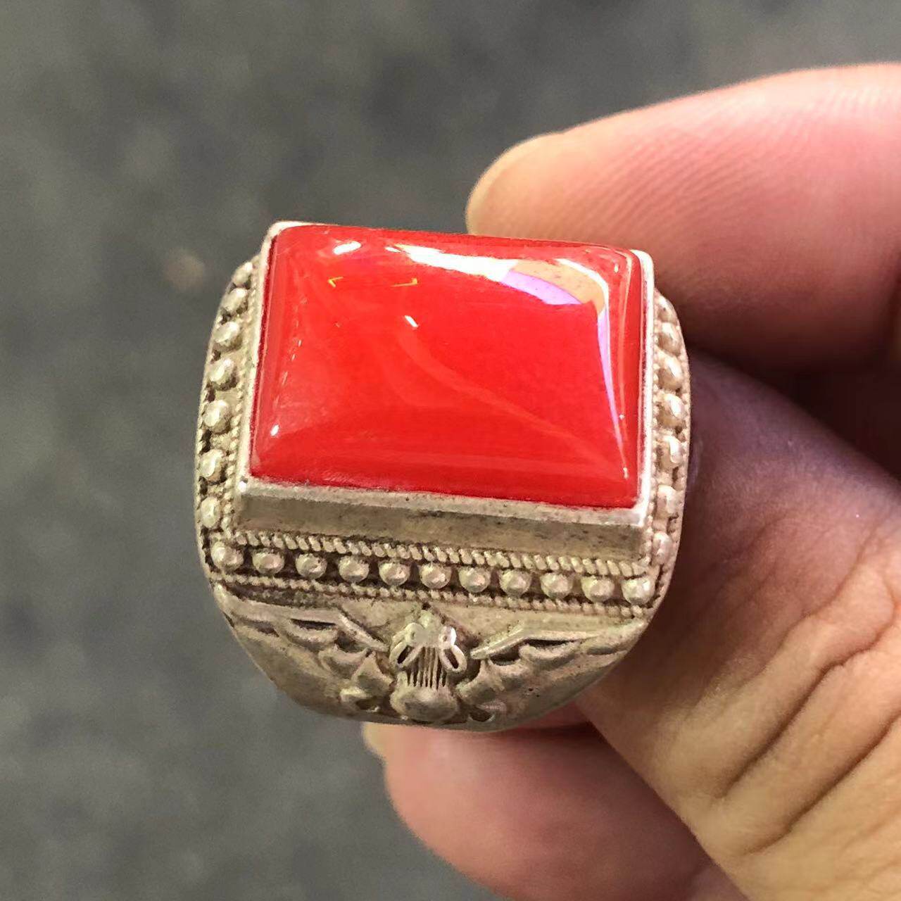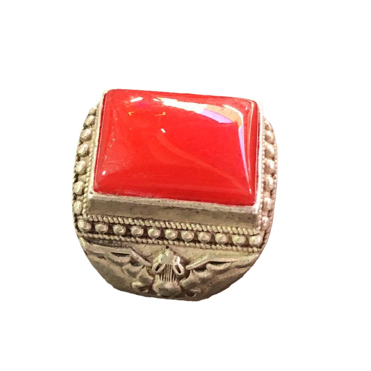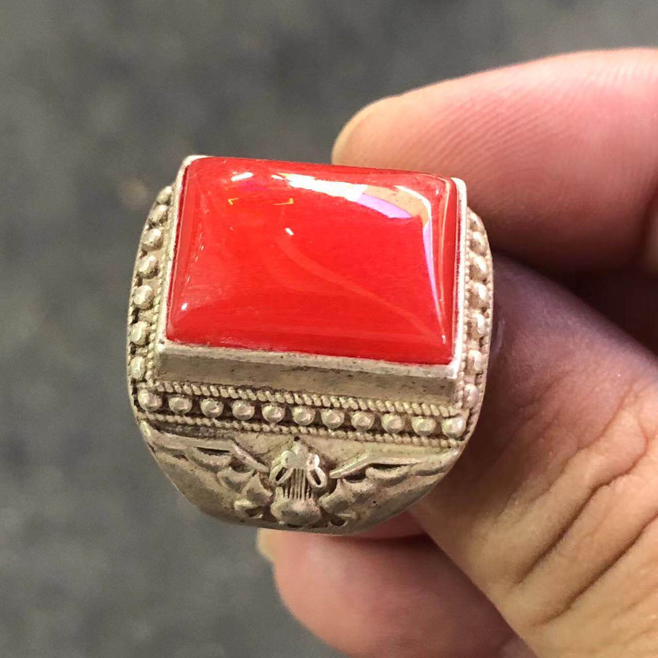 古玩杂项白铜镀银戒托镶嵌红色宝石戒面藏银开口戒指扳指饰品