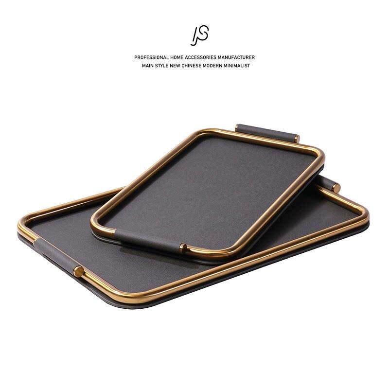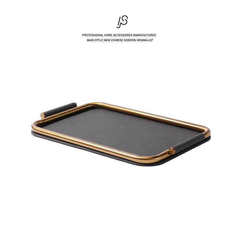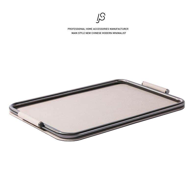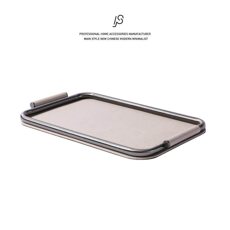 轻奢简约米灰色皮革不锈钢托盘样板间创意装饰盘客厅收纳盘香薰盘