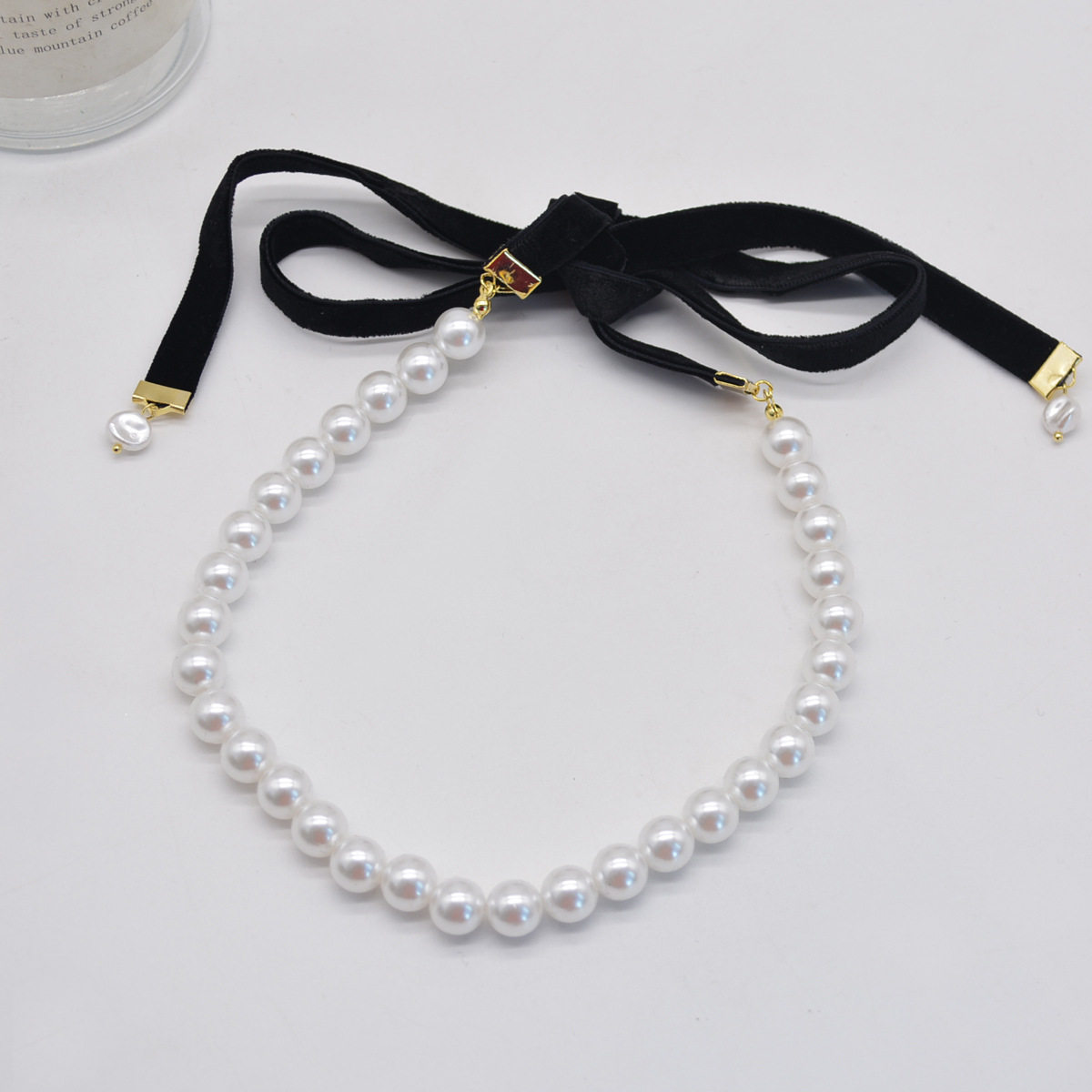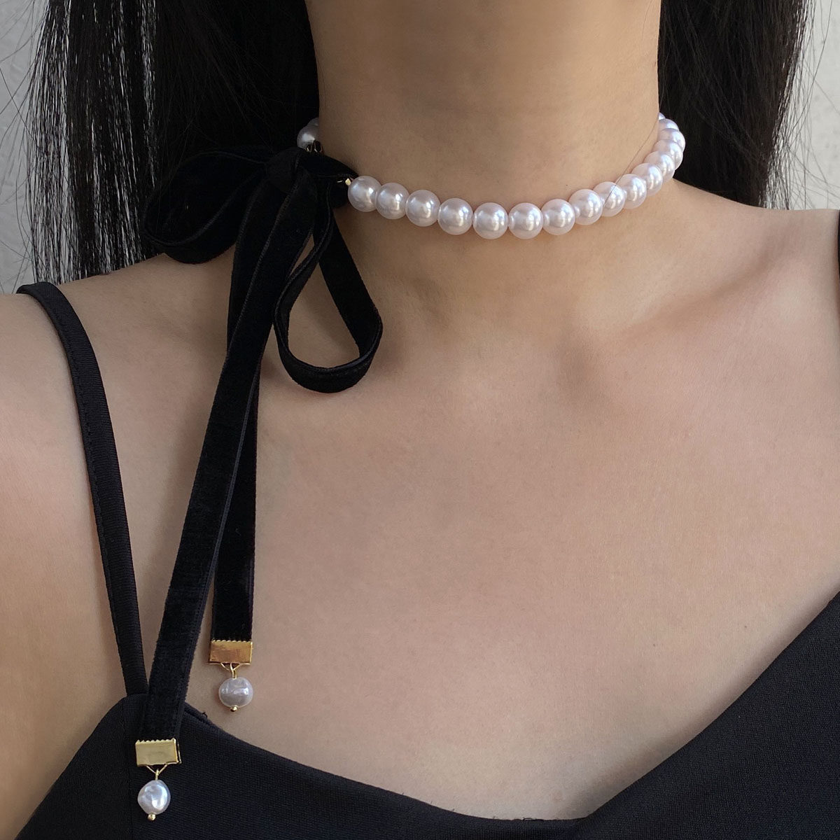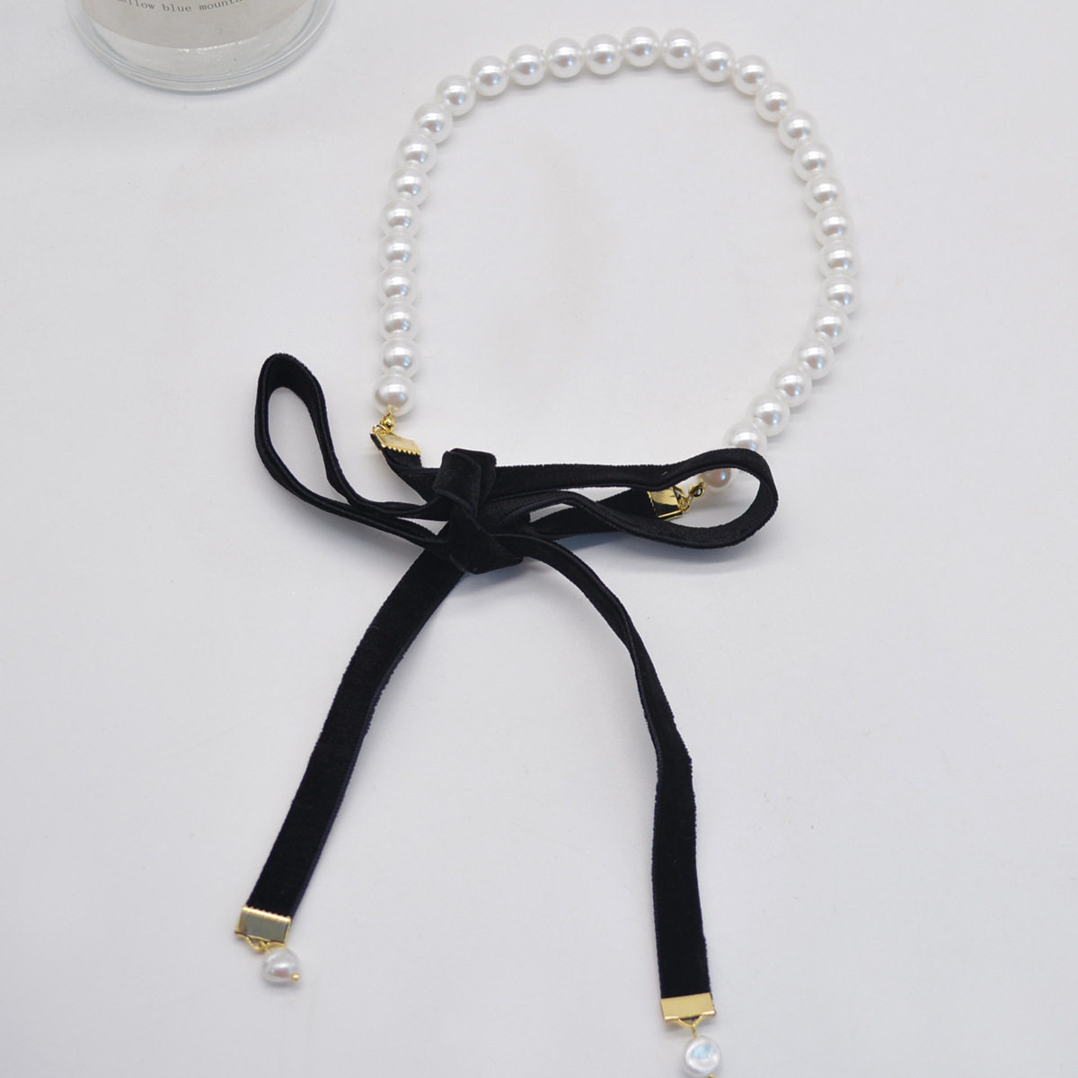 复古法式珍珠黑色丝绒蝴蝶结绑带颈链choker锁骨链女可调节项链
