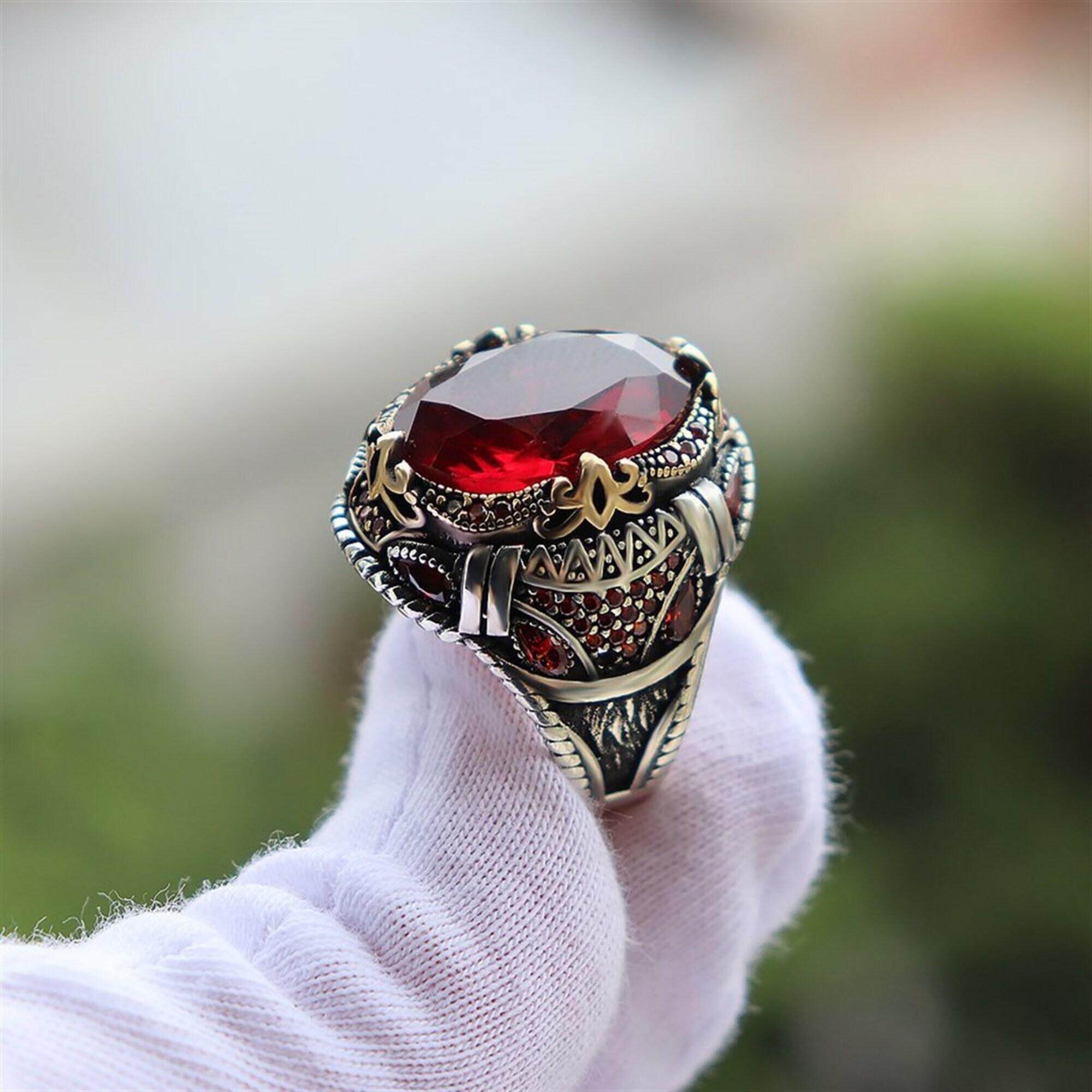 土耳其代购Jewelry㊣ 手作红色宝石男士纯银霸气指环朋克风戒指