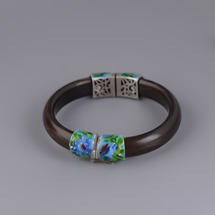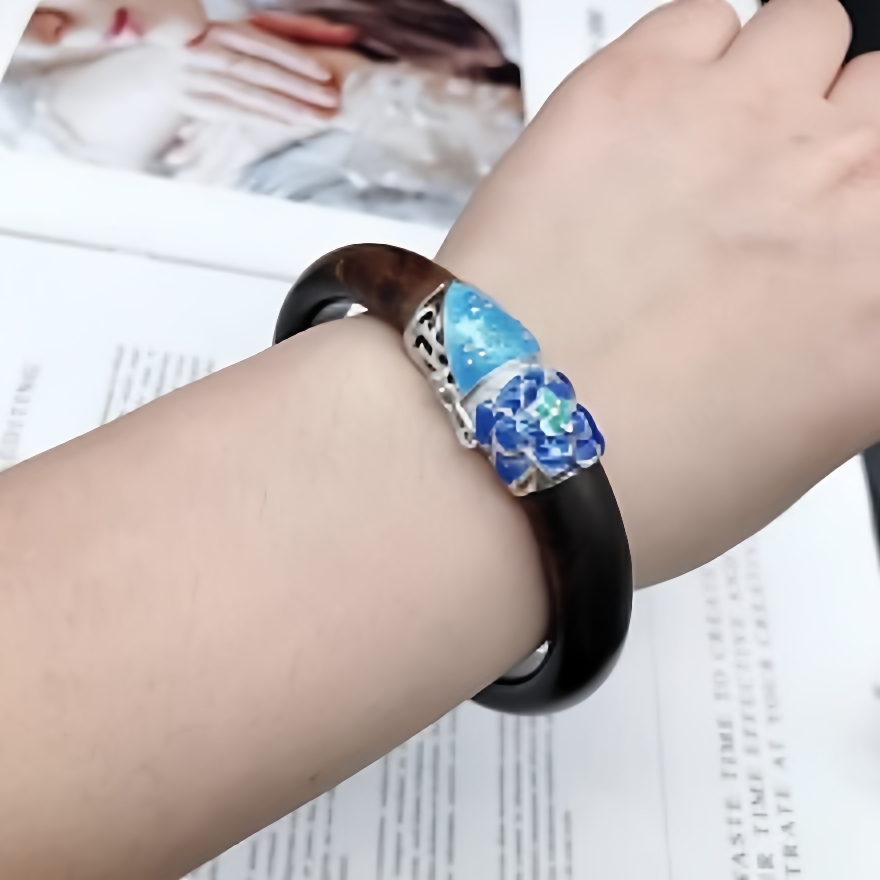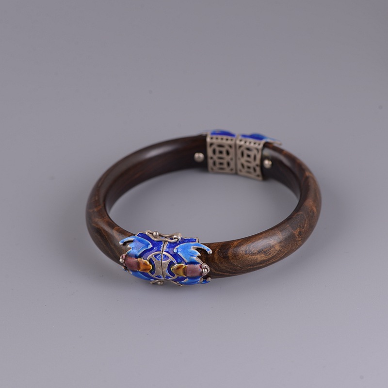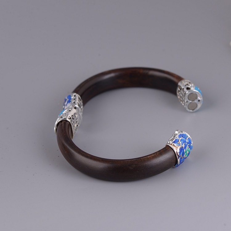 纯银开口手环复古富贵牡丹花烧蓝黑檀木手镯蝙蝠民族风景泰蓝镯子